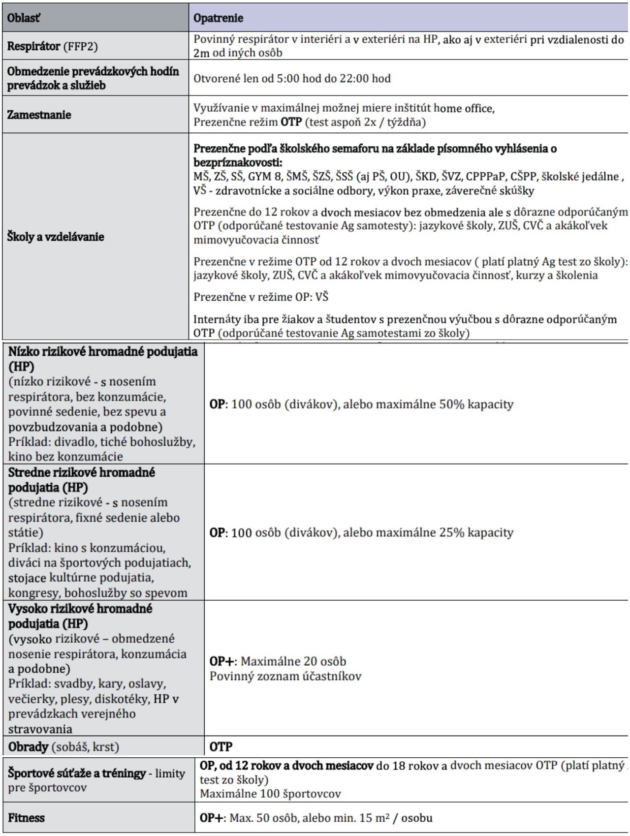 Režim OP spĺňajú „kompletne zaočkované osoby po dobu 9 mesiacov od ukončenia základnej očkovacej schémy, resp. od ostatnej ‚booster’ dávky, osoby po prekonaní COVID-19 viac ako 180 dní + jedna dávka vakcíny (ak vakcína bola podaná do 180 dní od prekonania potvrdeného RT-PCR) po dobu 9 mesiacov od prekonania COVID-19, osoby po prekonaní COVID-19 potvrdeného RT-PCR nie staršom ako 90 dní“.