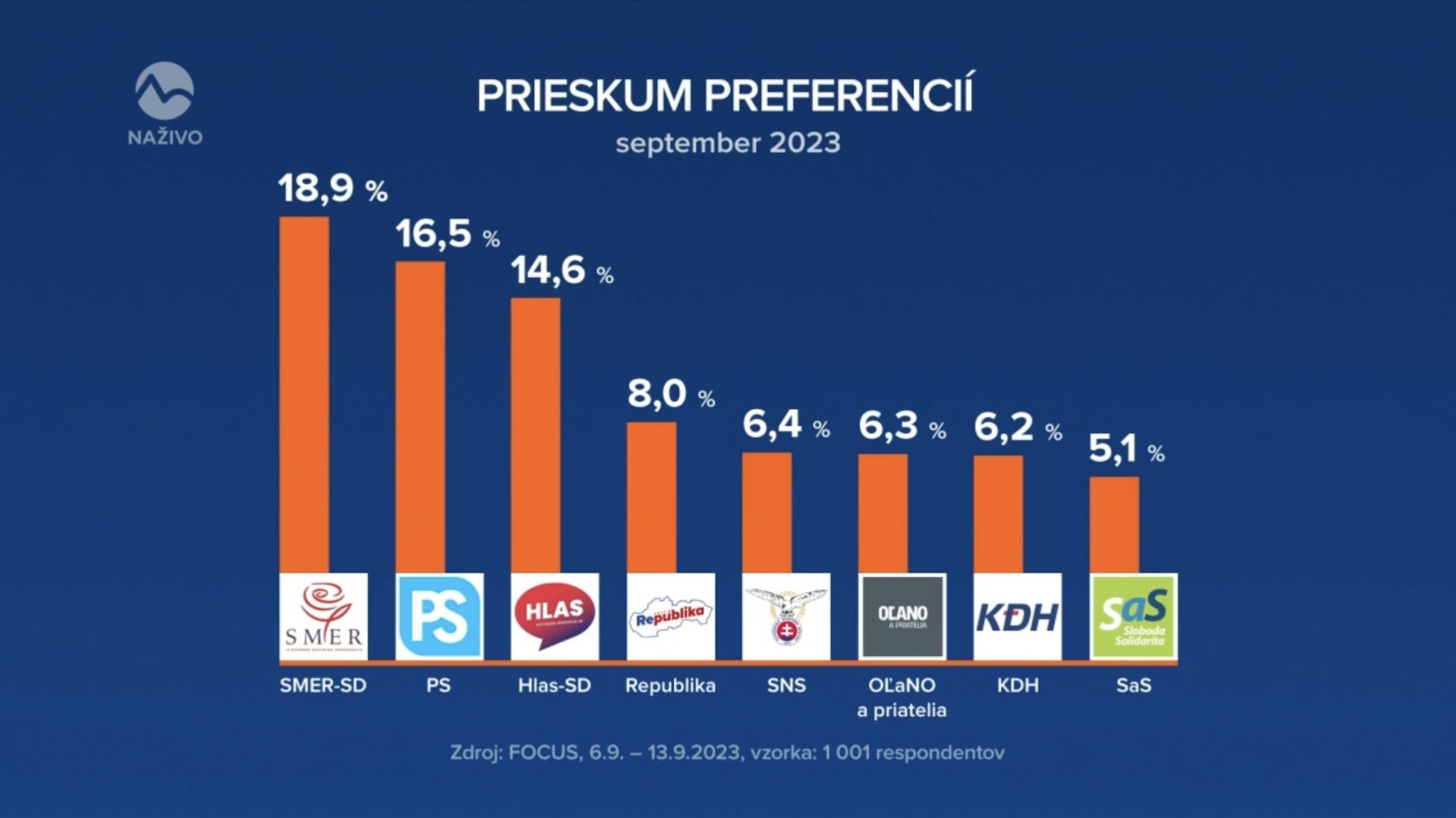 Na základe výsledkov prieskumu by Smer-SD v parlamente získal 37 kresiel, PS 33 a Hlas-SD 29. So 16 poslancami by bola v NR SR Republika, SNS by mala 13 mandátov, KDH 12 a SaS 10. Prieskum sa realizoval od 6. do 13. septembra na vzorke 1 001 respondentov.