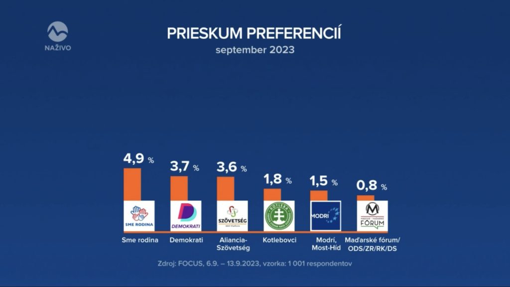 Pred bránami NR SR by ostalo aj hnutie Sme rodina (4,9 percenta), Demokrati (3,7 percenta), Aliancia (3,6 percenta), ĽSNS (1,8 percenta), Modrí, Most – Híd (1,5 percenta) a subjekty združené okolo Maďarského fóra (0,8 percenta).