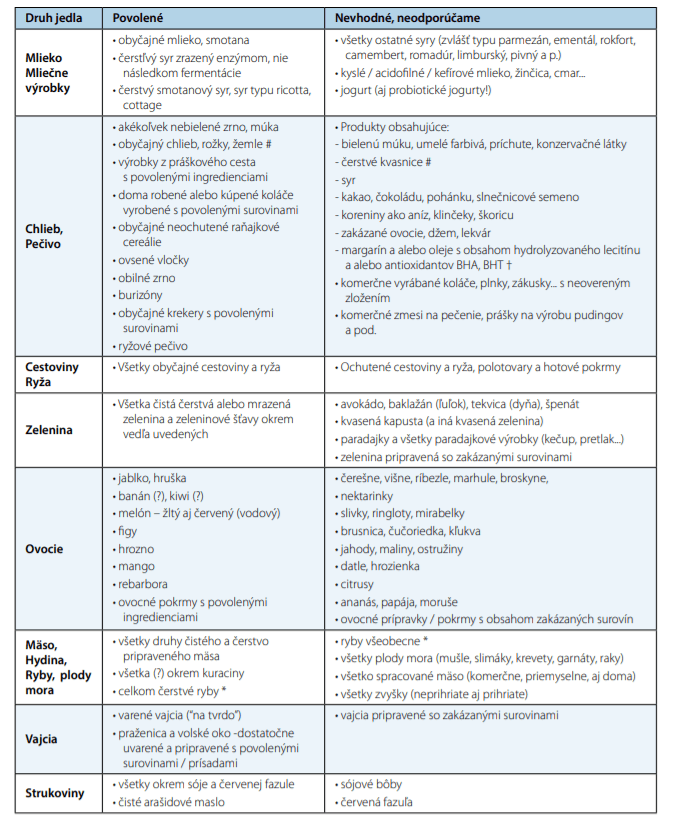 Za bezpečné potraviny sa považuje čerstvé mäso, okrem kuracieho, ktoré má vysoký obsah histamínu. Niektoré druhy ovocia.