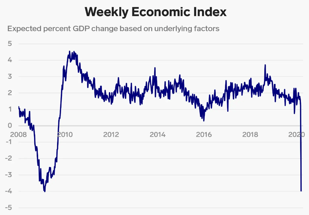Podľa amerického FEDu sa ekonomická situácia v USA už teraz podobá na krízu z roku 2009. FED vypočítava týždenný ekonomický index, ktorý meria ekonomickú aktivitu v reálnom case. Podľa posledných výpočtov to vyzerá, že americká ekonomika sa v dôsledku pandémie koronavírusu dostala do veľkej recesie už teraz, a to sme len na začiatku.