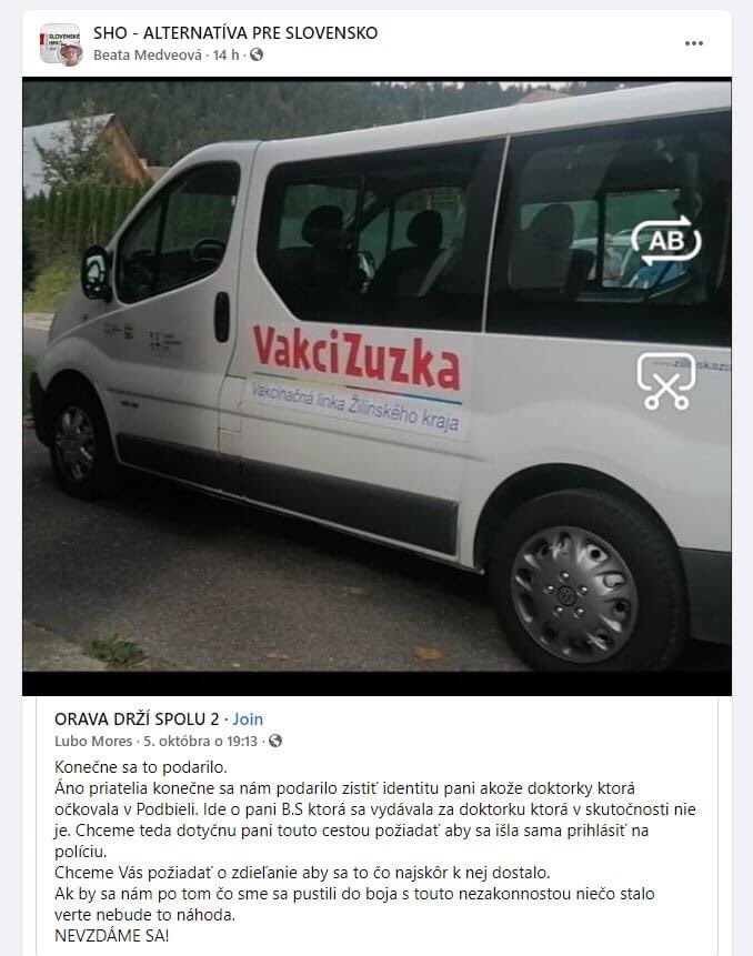 Najnovšie sa antivaxerom podarilo vypátrať zdravotníčku, ktorá ľuďom podávala očkovaciu látku. „Ide o pani B.S., ktorá sa vydávala za doktorku, ktorou v skutočnosti nie je. Chceme teda dotyčnú pani touto cestou požiadať, aby sa išla sama prihlásiť na políciu,“ vyzývajú protestujúci ženu vo facebookovej skupine Orava drží spolu 2.