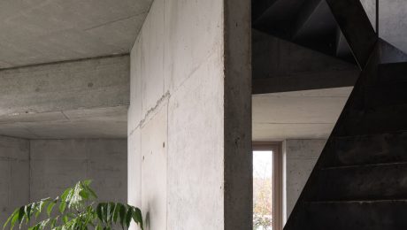 Nosná konštrukcia domu je z betónu, ktorý nielen zabezpečuje statiku, ale zároveň tvorí vnútornú skulptúru priestoru. Tento betónový skeleton sa stáva súčasťou interiéru, ktorý architekti navrhli v minimalistickom duchu s dôrazom na hrubú estetiku materiálu.