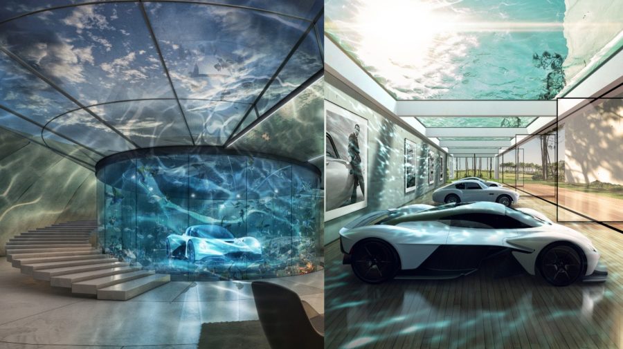 Svetlo sveta uzreli aj prvé vizualizácie garáží. Objavujú sa tu tradičné presklenné vitríny, ale aj zložitejšie stavby zakomponované do terénu krajiny. Jedna z luxusných garáži má v sebe dokonca zabudovaný výťah na manipuláciu s modelom. Čerešničkou na torte je fakt, že tento výťah je presklenný a ohraničený akváriom. V inom návrhu zase Aston Martin Valkyrie stojí na podstavci s cirkuláciou vody, takže to na prvý pohľad pôsobí tak, ako by stal na hladine vody.