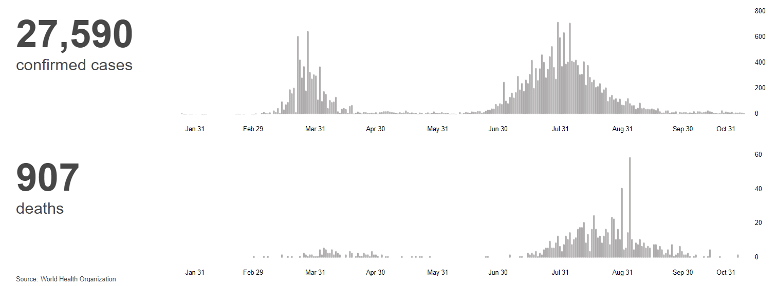Ani u nás sme cez leto nemali veľa prípadov. Austrália je na južnej hemisfére a leto im začína v decembri. Za posledné dva mesiace sa teploty významne zvýšili a je to vidieť aj na grafe. Zatiaľ čo počas nášho leta denne zaznamenávali stovky prípadov, v septembri čísla rapídne klesli.