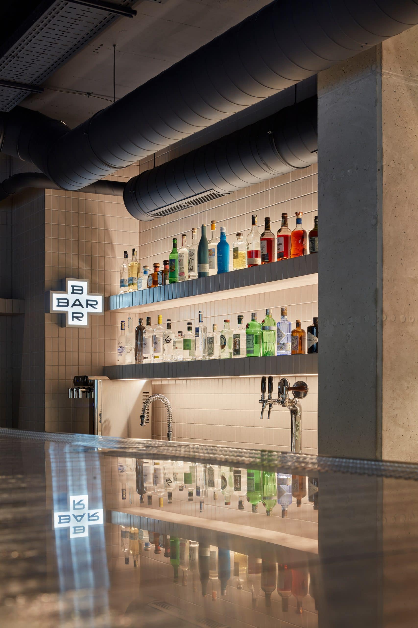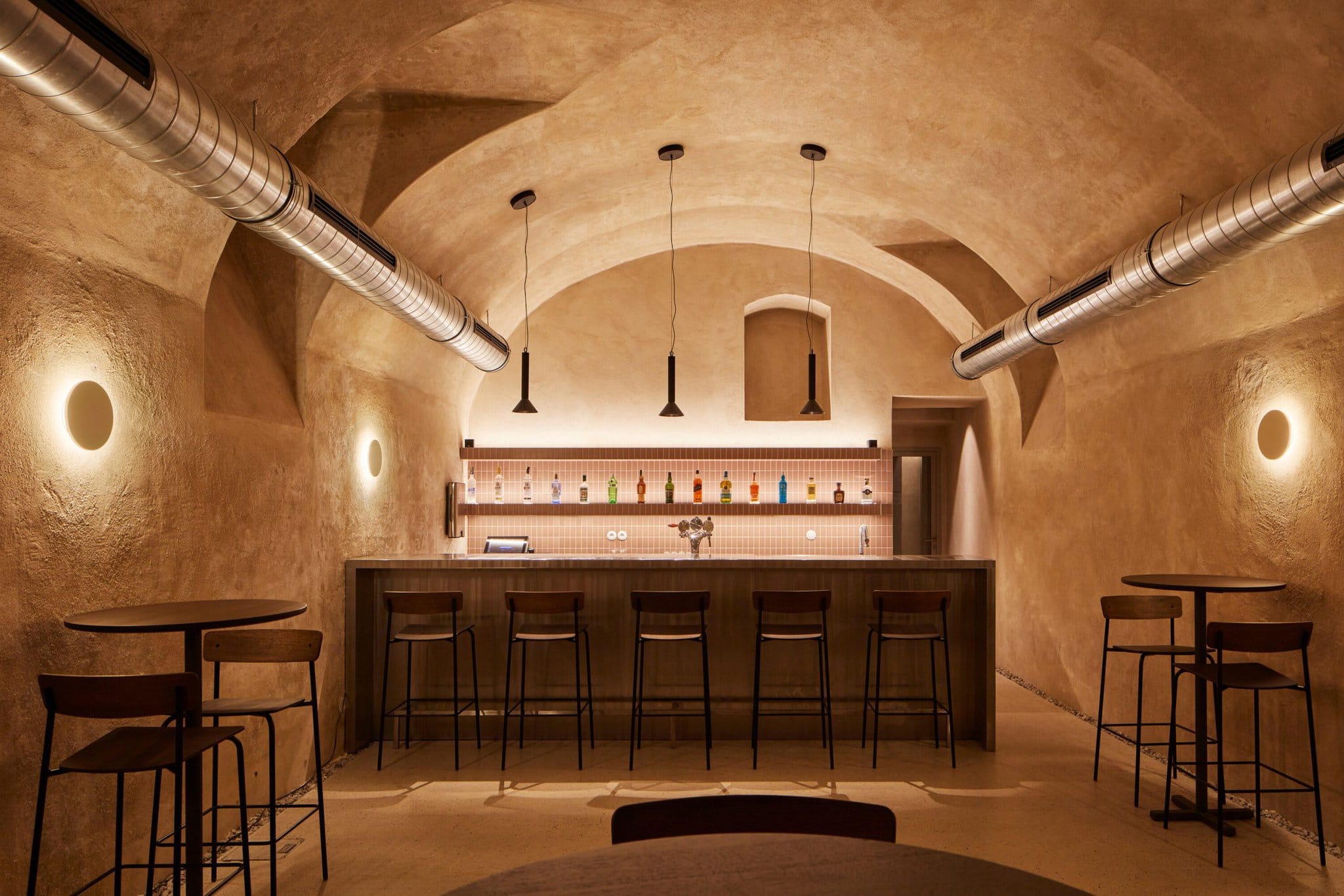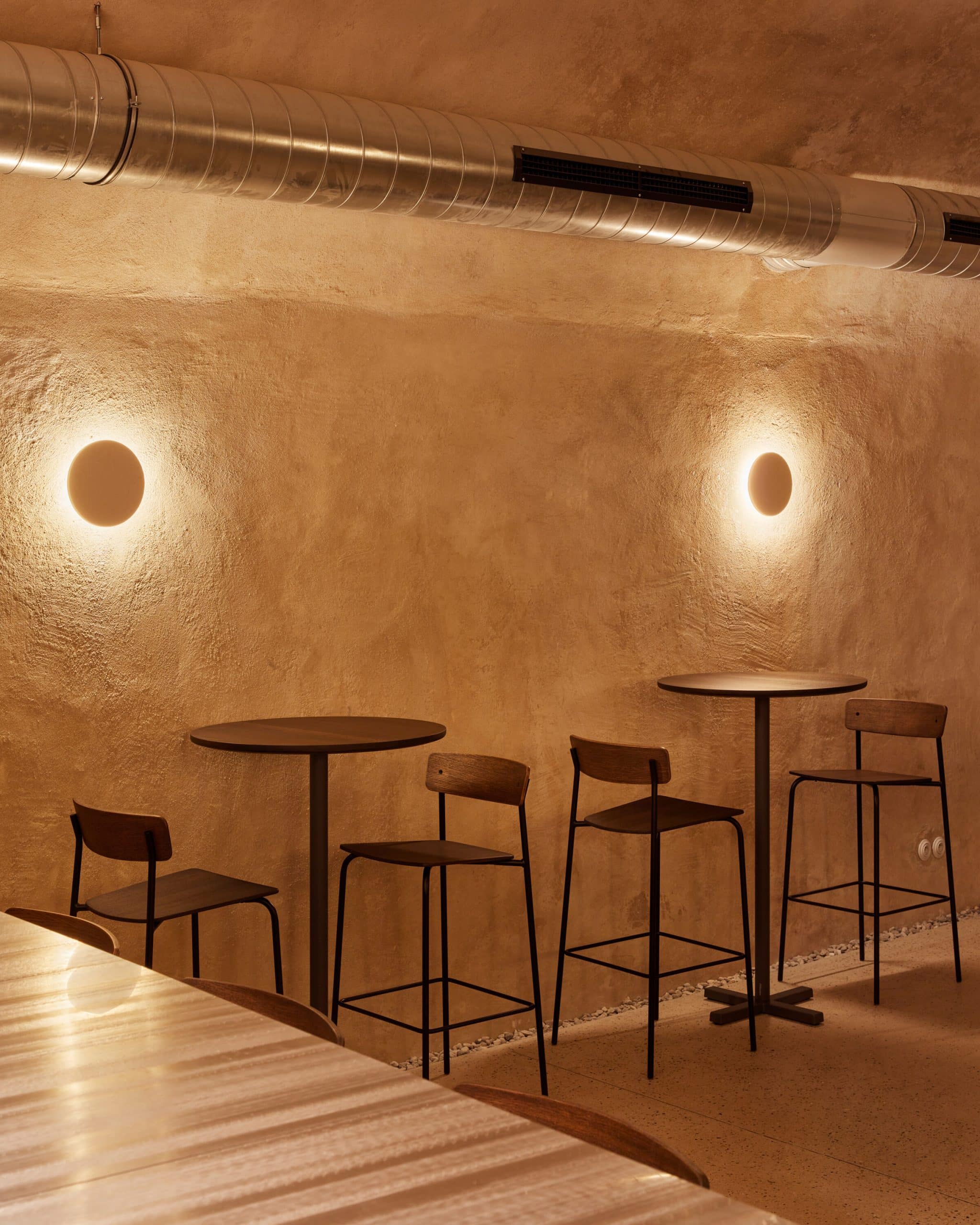 Hlavným zjednocujúcim prvkom je na výšku kladený keramický obklad, ktorého farebnosť postupne tmavne od najsvetlejšieho odtieňa v kaviarni po najtmavšiu v podzemnom bare. Na rovnakom princípe architekti pracujú aj s nábytkom, stolárskymi výrobkami a ich (ne)čalúnením.