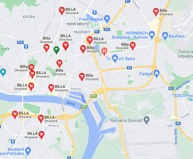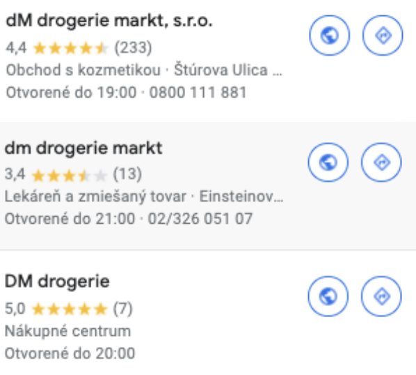 Veľké obchodné reťazce a siete (čerpacie stanice, drogérie, kníhhkupectvá, banky, poisťovne…) nevyzerajú v Mapách Google „akoby ich jedna mater mala“. Rôzne verzie názvov prevádzok či rôzne logá nie sú ničím výnimočným.