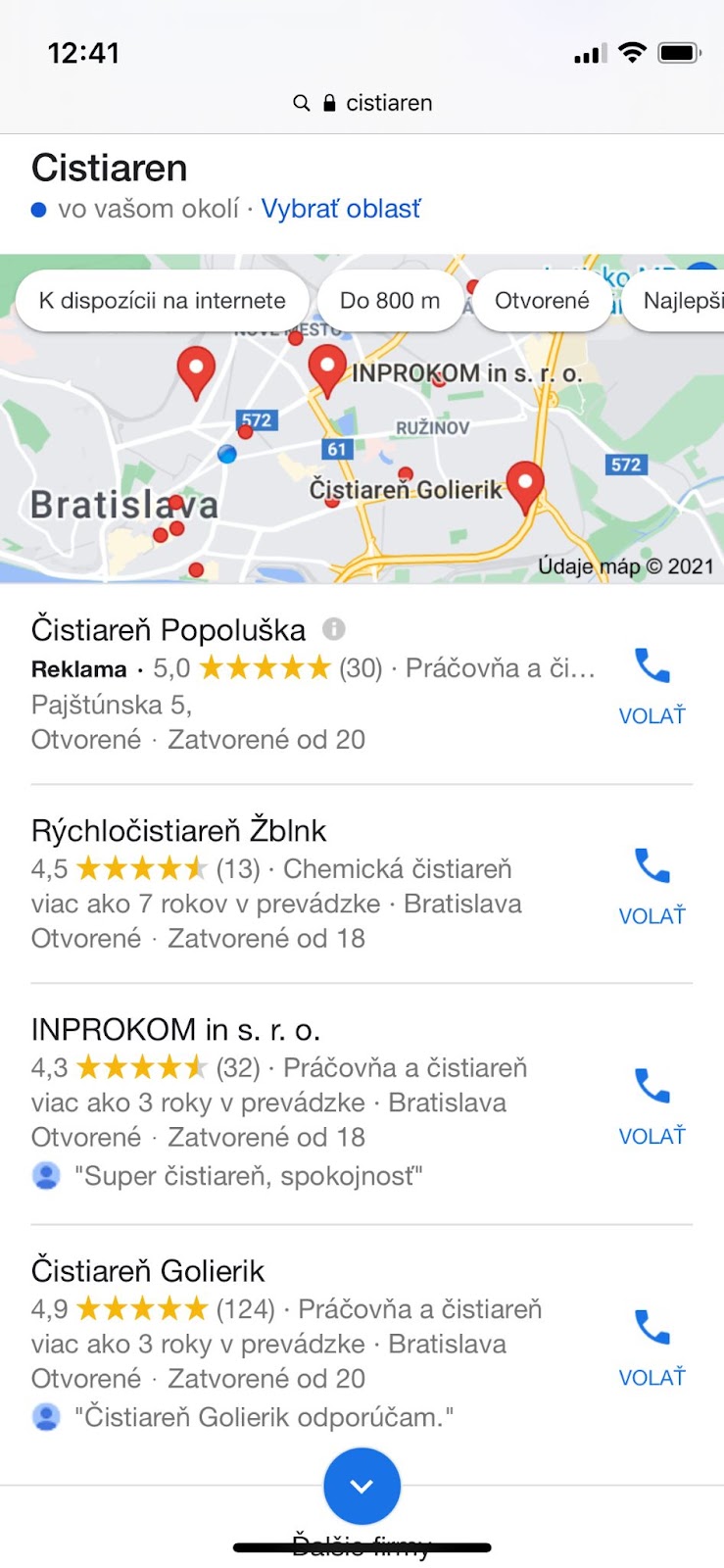 Polohu a adresu (s možnosťou spustiť na 1 klik navigáciu, otváracie hodiny, recenzie od zákazníkov a aj telefónne číslo (s možnosťou spustiť telefonát na 1 klik) nám Google ukáže aj bez toho, že špecifikujeme lokalitu. Predsa vie, kde sa nachádzame!