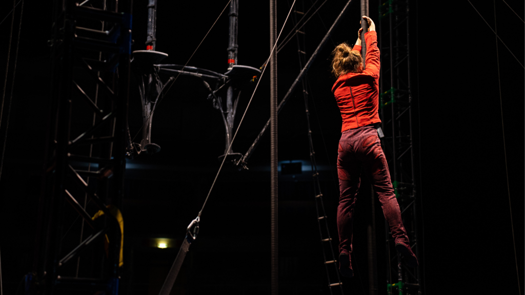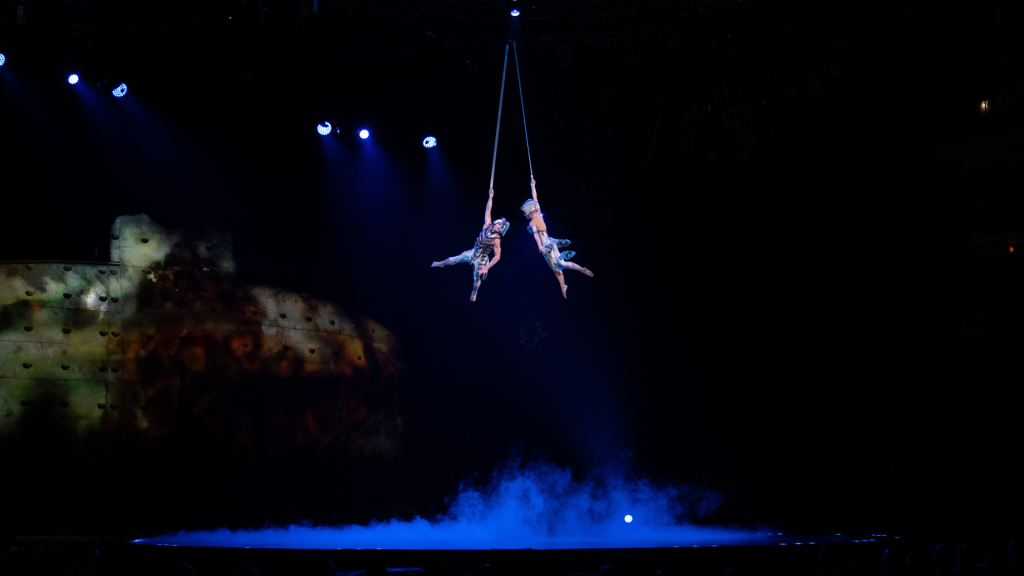 Ako sa vnárame stále hlbšie a hlbšie do zákulisia pražskej O2 arény, ťahavé melódie harmoniky strieda Blue World od Maca Millera. Do tónov známej skladby pár akrobatov na improvizovanom cvičisku skúša posledné kúsky show.