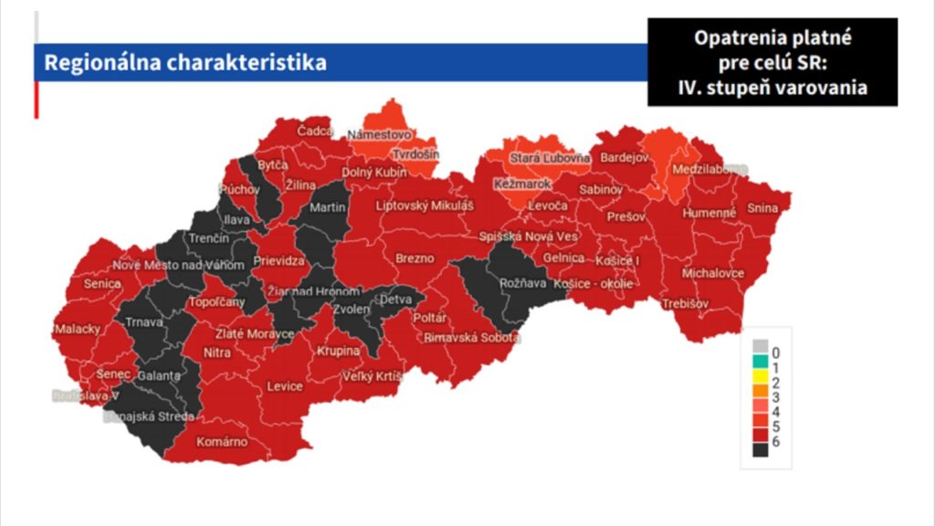 Od pondelka 1. marca je 20 okresov v čiernej farbe, ide o Bánovce nad Bebravou, Detva, Dunajská Streda, Galanta, Hlohovec, Ilava, Martin, Nové Mesto nad Váhom, Partizánske, Piešťany, Považská Bystrica, Revúca, Rožňava, Šaľa, Trenčín, Trnava, Turčianske Teplice, Žarnovica, Žiar nad Hronom a Zvolen.