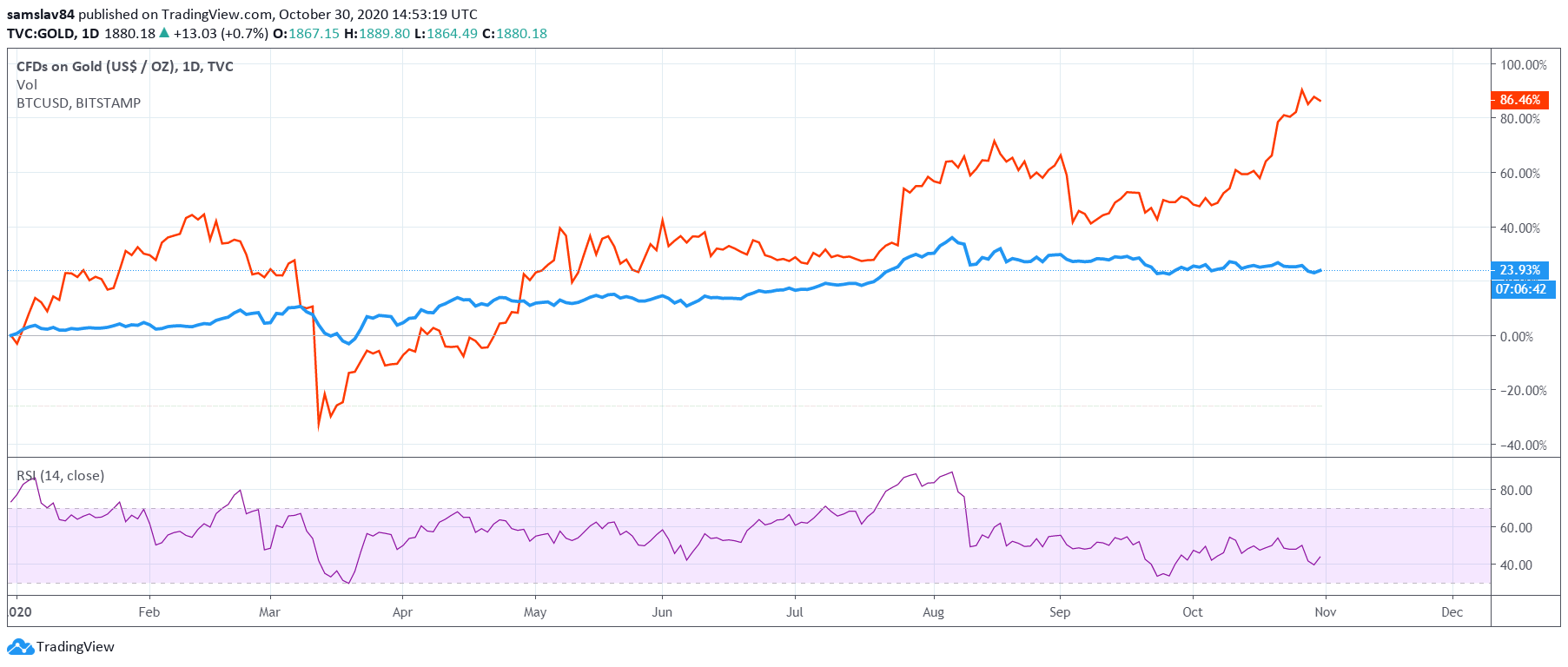 Ak sa pozrieme na reakcie Bitcoinu na makroekonomické udalosti počas tohto roka, môžeme konštatovať, že splnil svoju úlohu uchovávateľa hodnoty. V súčasnosti sa obchoduje približne 35 % nad cenou spred krízy a 100 % nad cenou z januára 2020. Narozdiel od zlata, ktoré od nového roka zvýšilo svoju hodnotu o necelých 25%.