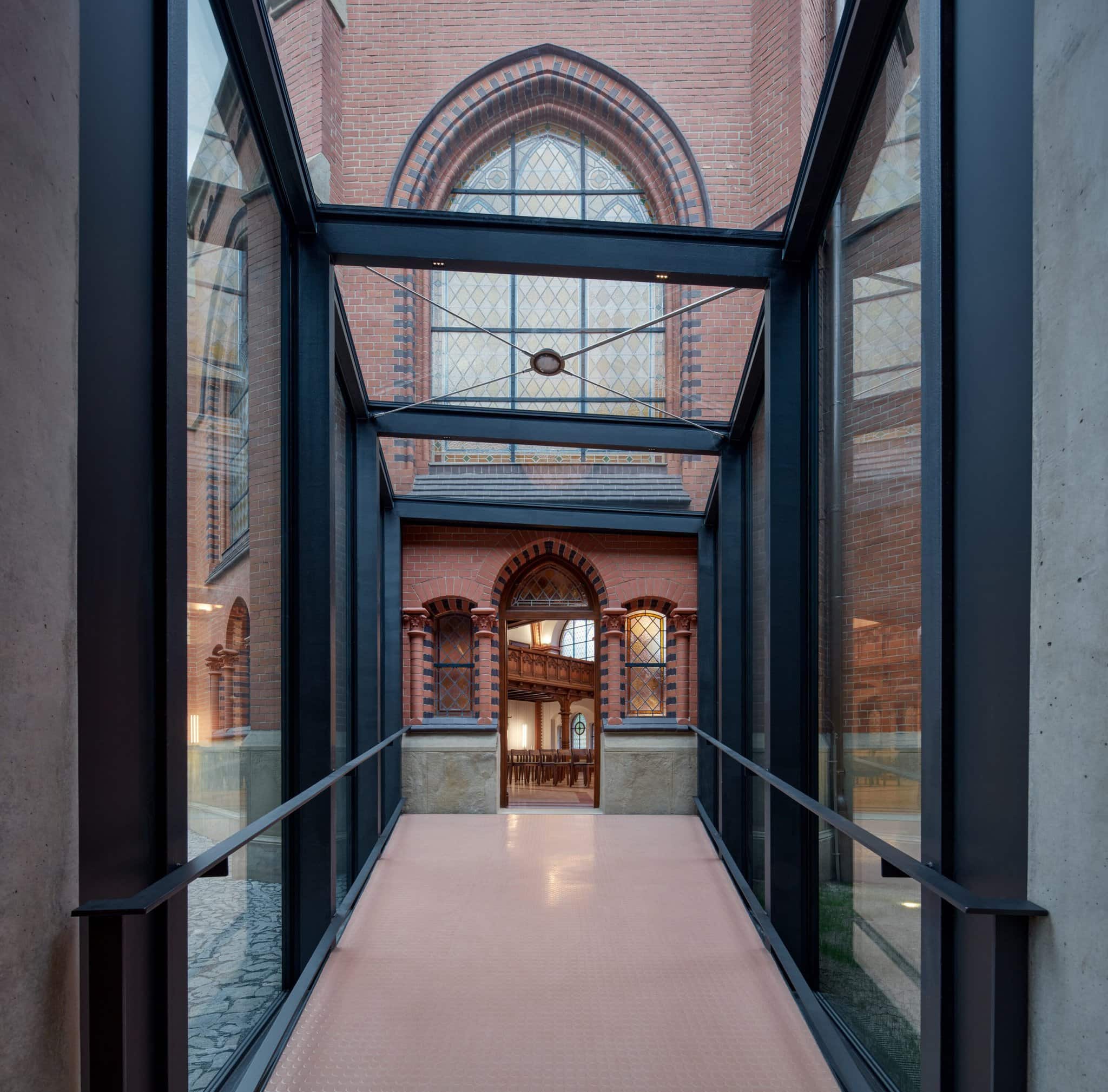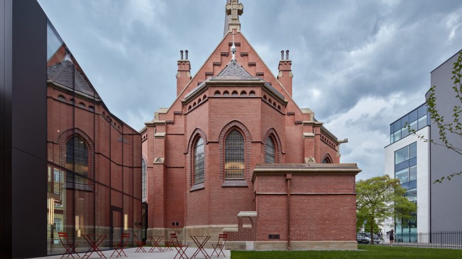 „Nové využitie kostola však vyžadovalo aj nutné prevádzkové zázemie, čo nebolo možné riešiť v pôvodných priestoroch stavby. Aby sme sa vyhli nevhodným zásahom do objektu kostola, rozhodli sme sa pre jeho doplnenie o novú hmotu, ktorá by na seba vzala bremeno prevádzkového a sociálneho zázemia,“ uvádzajú architekti stojaci za obnovou.