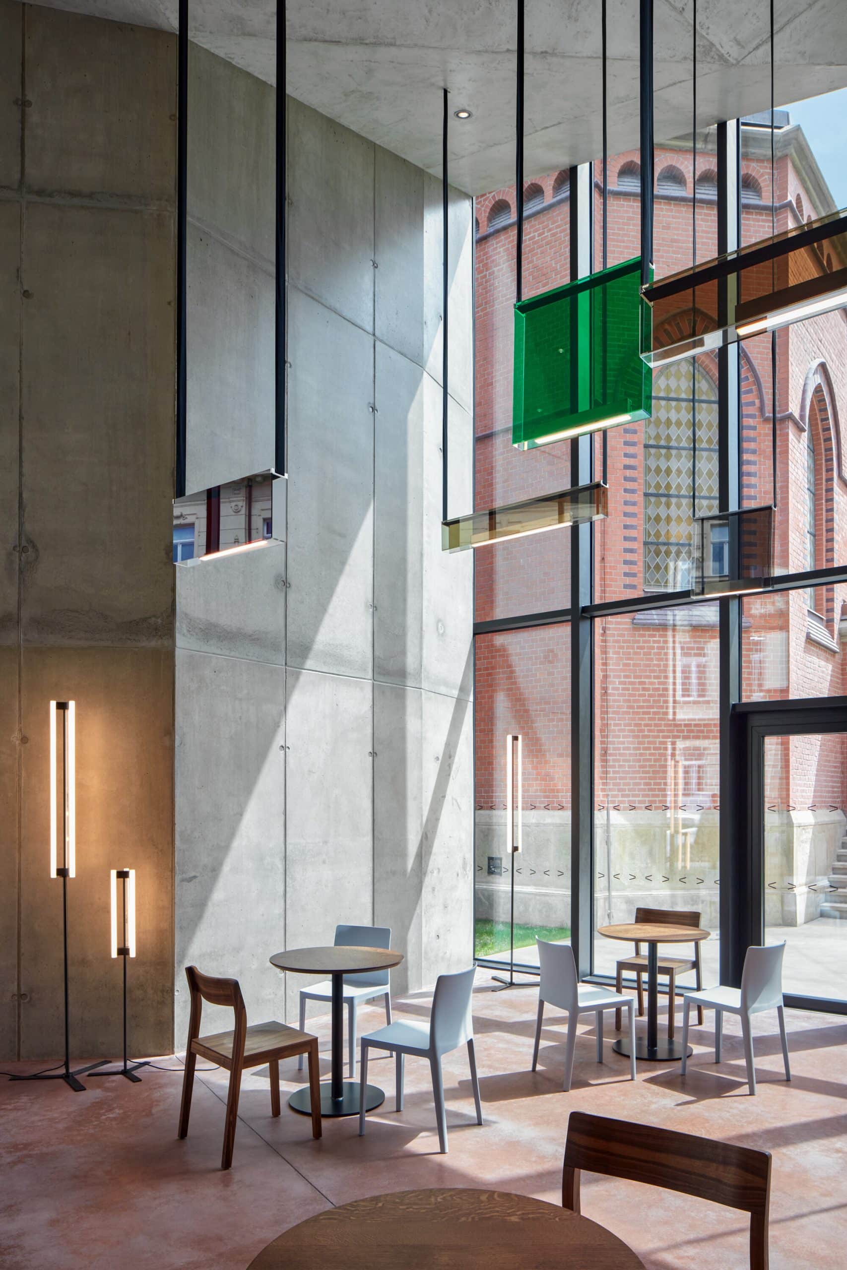 Kaviarenské stolíky sú navrhnuté na mieru a prinášajú vo svojom detaile inšpiráciu z prvkov kostola aj do modernej prístavby. Stojacie lampy značky Kaia, pripomínajúce moderné pochodne, sú umiestnené okolo oboch priestorov a umocňujú príjemnú atmosféru kostola.