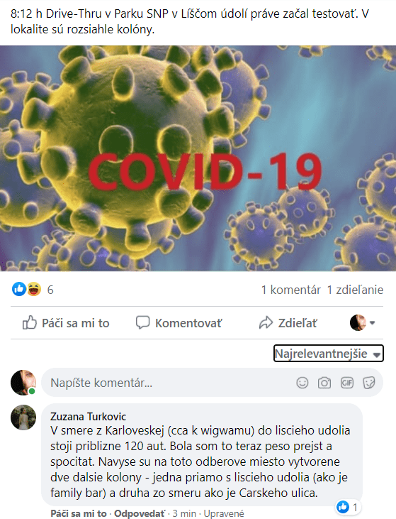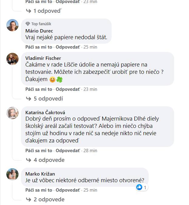 Ľudia na facebooku tvrdia, že u niektorých testovacích miestach je kolóna, keďže štát nedodal niektoré papiere, potrebné k odberom