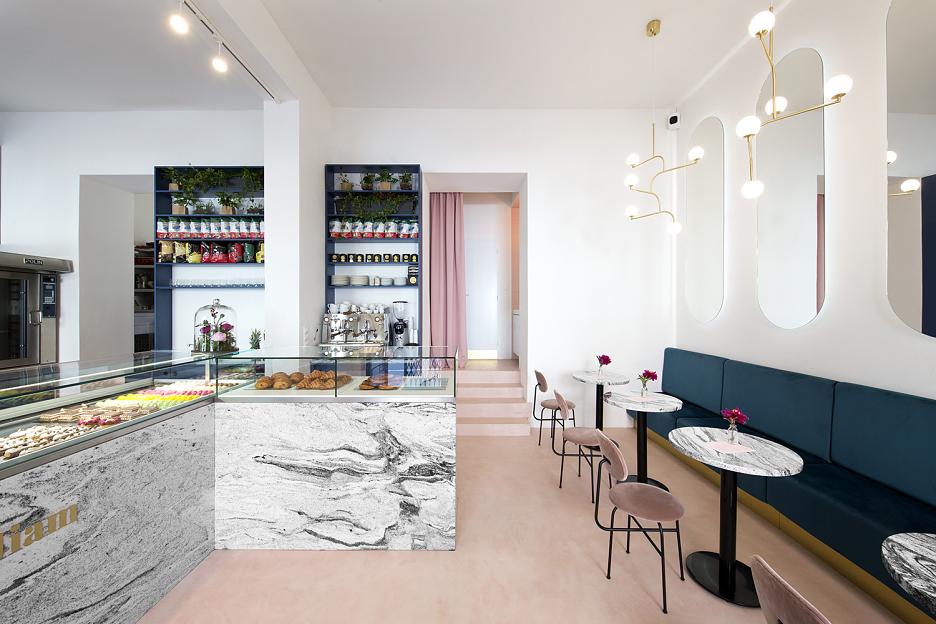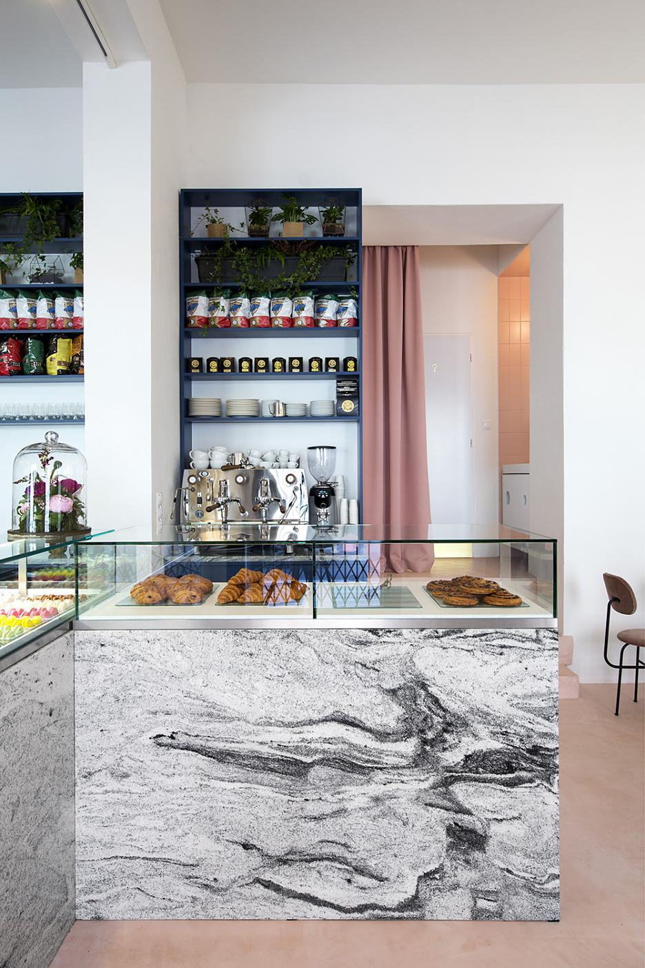 Tých je hneď niekoľko – najdôležitejším spojovacím prvkom je jemná ružová farba. Tá sa objavuje vo vizuálnej identite i v interiéri v rôznych materiálových prevedeniach. „Cukrový“ efekt ružovej mramorovanej podlahy sa „rozlieva“ po celom monopriestore, vystupuje na schodíky do vyvýšenej hygienickej zóny a zázemia za výrobňou. Tieto priestory sú taktiež odhalené oku návštevíka. V hygienickej časti sa ružová v dámskej toalete mení na rovnako zafarbený obklad, tak ako v nike v predmiestnosti so spoločným umývadlom – pre dámy i pánov.