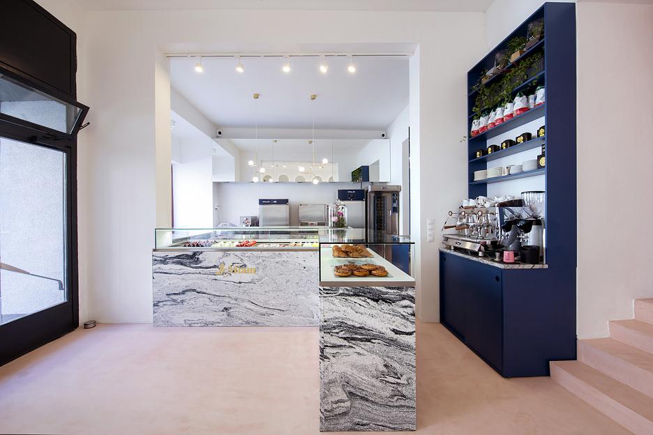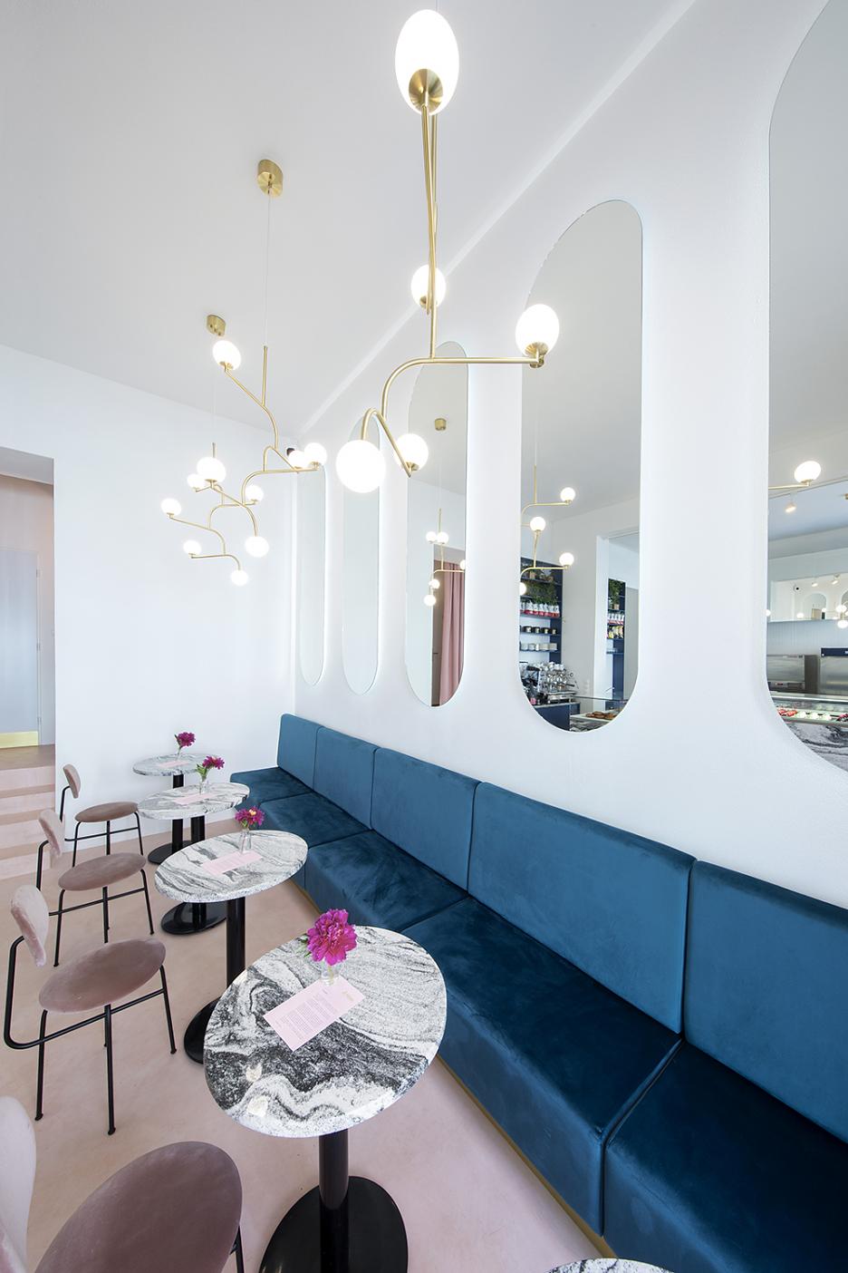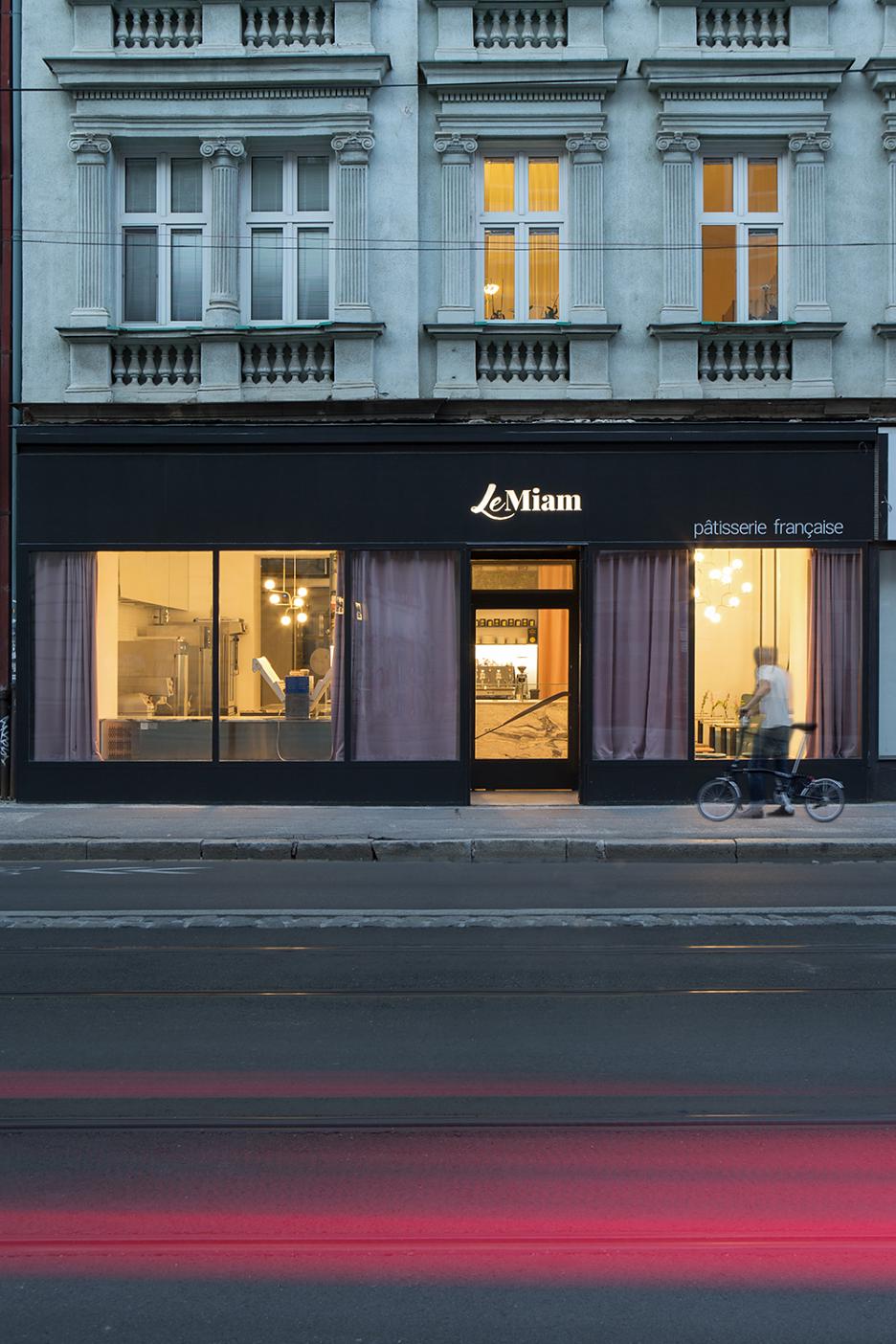 Na rušnej Špitálskej ulici sa nakoniec našiel vhodný priestor – okrem toho, že má atmosféru veľkomesta, ponúkal aj ideálny priestor pre výrobňu priamo prepojenú s kaviarňou. To bol základ konceptu – cukrárne i architektúry. Monopriestor, kde hranicu medzi kaviarenskou časťou a výrobňou tvorí na mieru vytvorená vitrína plná farebných sladkostí. Návštevníci si pri príchode môžu prezrieť zákusky. Ak zotrvajú a ich pohľad skĺzne iba o kúsok ďalej, vychutnajú si aj ich výrobu v priamom prenose.