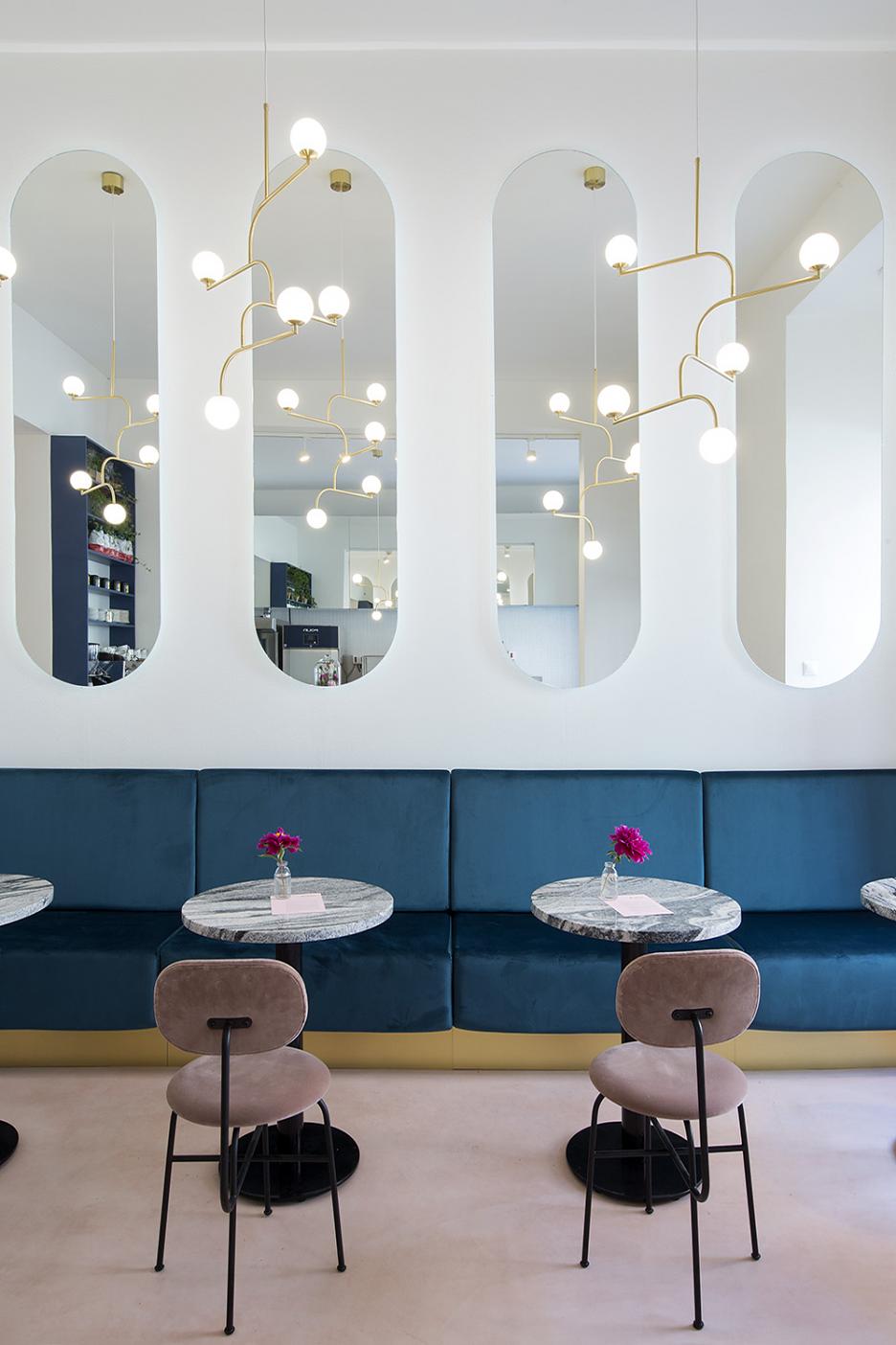 Mosadz je rovnako významným materiálom v priestore – odkazuje na eleganciu klasických francúzskych cukrární. Rozvetvené rúrkové svietidlá s malými sklenými guľami na ich koncoch „uzatvárajú“ vysoký – viac ako štvormetrový priestor a vytvárajú tak noblesnú kaviarenskú atmosféru. Ich menšie dvojičky sú umiestnené i vo výrobnej časti nad centrálnym ostrovom. Efekt početných svetelných zdrojov je podporený zrkadlením. Na hlavnej stene v kaviarenskej časti v piatich vysokých oblých zrkadlách, ktoré sú lemované tlmeným podsvietením a vo výrobnej časti v zrkadlovej stene ukrývajúcej technologické rozvody.