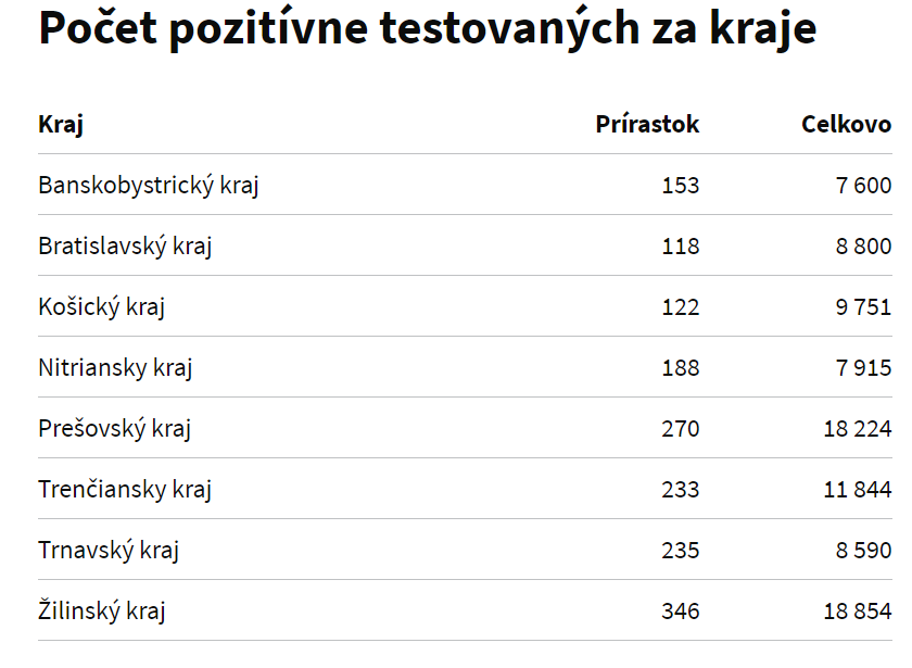 Ak sa pozrieme na kraje, uvidíme, že situácia je odlišná. Najviac zasiahnutý je stále Žilinský kraj, kde doteraz bolo potvrdených 18 854 prípadov nákazy koronavírusom. Po ňom nasleduje Prešovský kraj 18 224 a Trenčiansky kraj 11 844. Bratislavský kraj má doteraz potvrdených 8 800 prípadov.