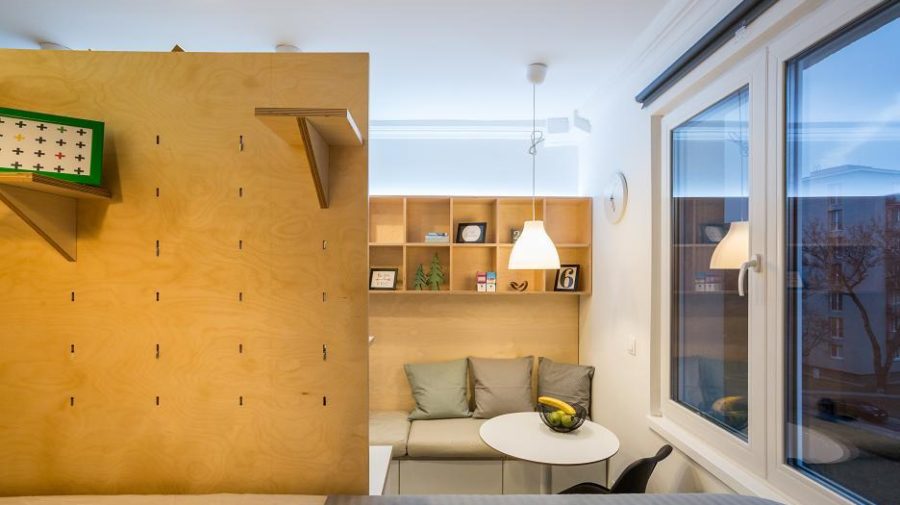 Najmenší byt v Bratislave bol veľkou výzvou, v ktorej sa bojovalo o každý centimeter štvorcový. Požiadavkou investora bolo vytvoriť životný priestor pre dvoch dospelých ľudí, úlohou architekta bolo vytvoriť plnohodnotné spanie, jedenie, kuchynský kút, dostatok úložných priestorov a kúpeľňu, v ktorej budúci obyvatelia nedostanú klaustrofóbiu.
