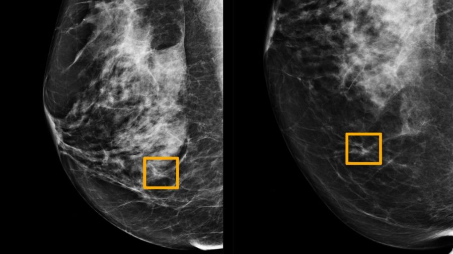 Žlté políčko na obrázku označuje, kde systém AI zistil, že rakovina sa skrýva vo vnútri prsného tkaniva. Šesť predchádzajúcich rádiológov nedokázalo nájsť rakovinu v rutinných mamografických vyšetreniach.