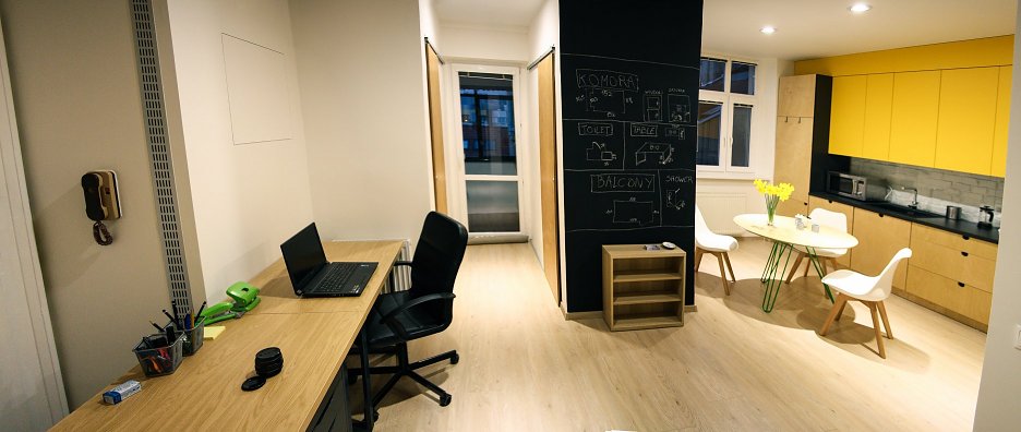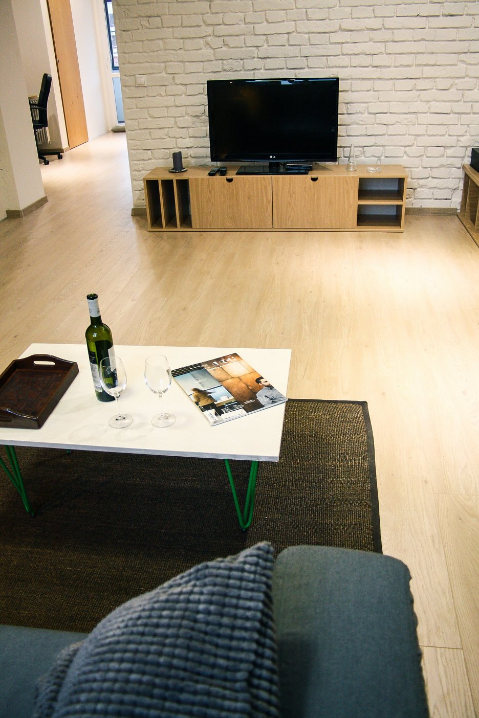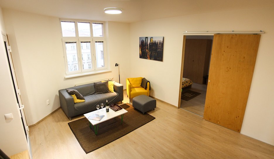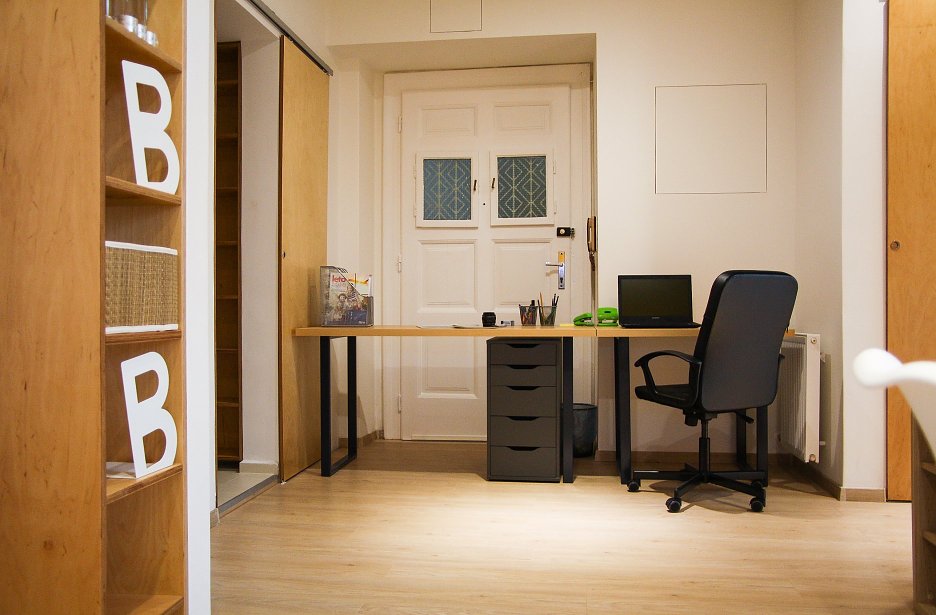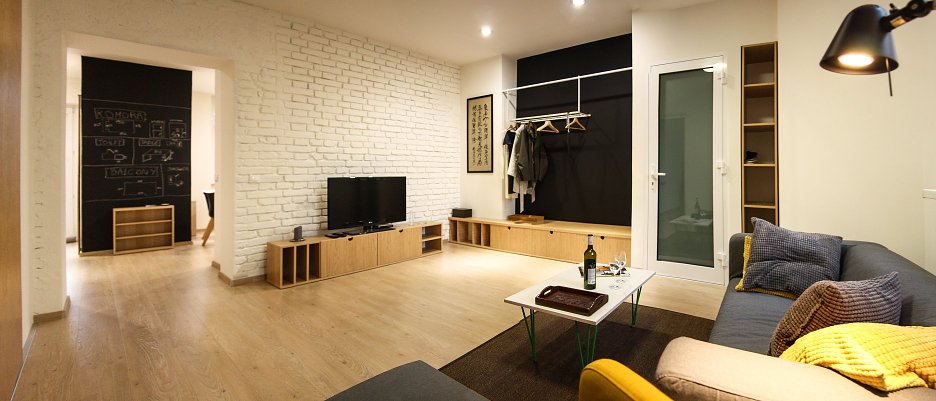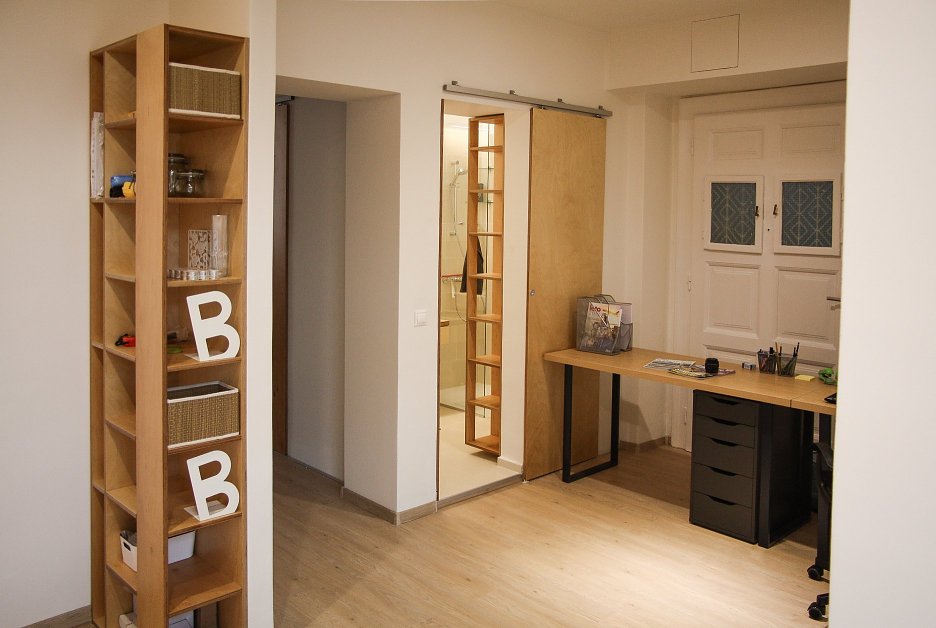 Pôvodne pomerne tmavý, 2,5 izbový byt v dome z 20‐tych rokov minulého storočia prešiel kompletnou rekonštrukciou. Nevyhovujúca dispozícia, nedostatok svetla a v neposlednom rade vek samotnej budovy sa podpísali na pôvodnom vizuálnom dojme. Využiť potenciál lokality bolo možné len kompletnou premenou – nové rozvody, podlahy, omietky, podhľady aj zmena usporiadania priestoru. Keďže už od začiatku sa počítal s využitím bytu na prenájom, tejto požiadavke bolo výrazne prispôsobené dispozičné riešenie ako aj celkov rozpočet.