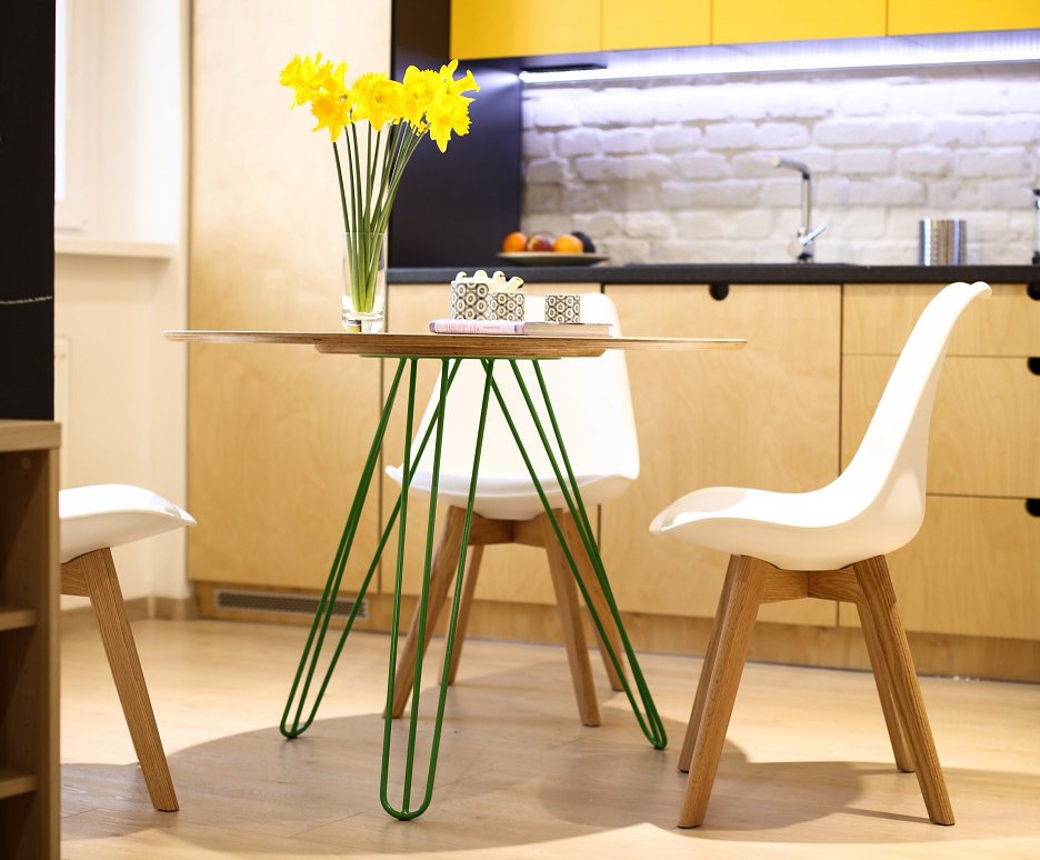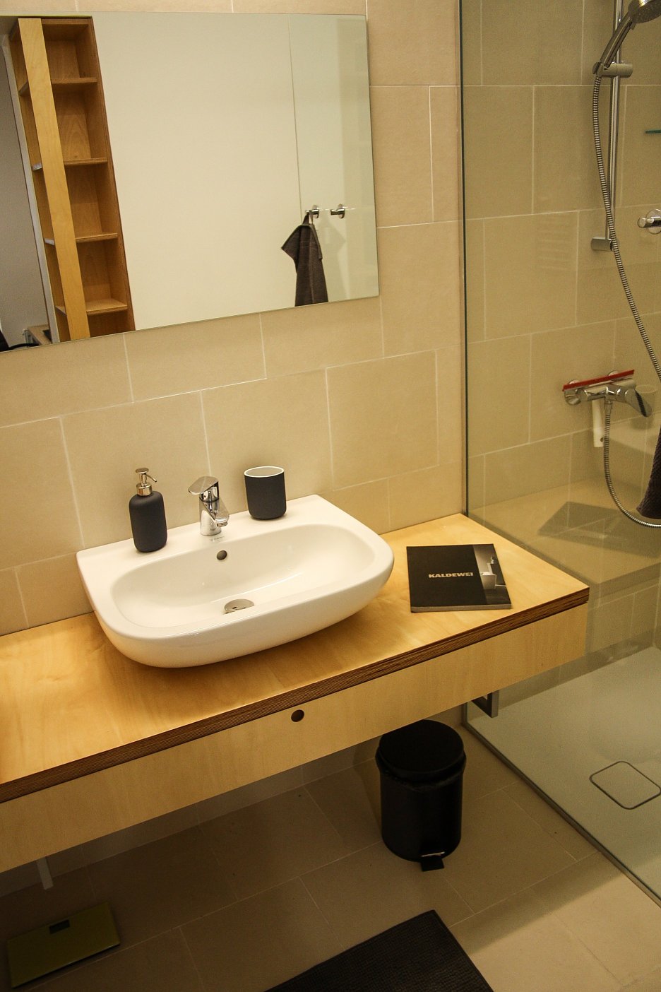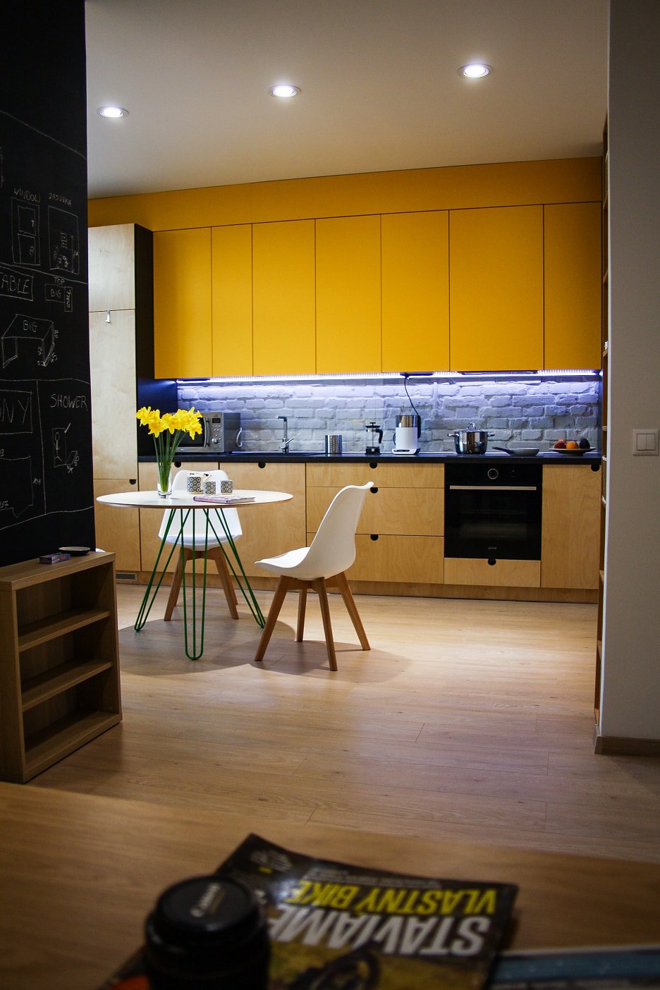 V materiálovom riešení prevláda stolárska preglejka, doplnená čiernou tabuľovou farbou, autentickou tehlovou stenou a ako akcent žltá laminovaná doska. V kuchyni sme tiež priznali pôvodnú tehlovú stenu a povýšili ju na nasvietenú industriálnu prezentáciu za čírym sklom.