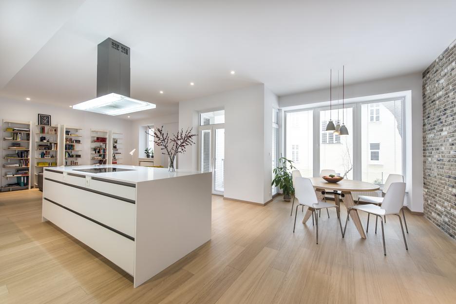 - Interiér v starom bytovom dome s vysokými stropmi. Byt s pôvodne tmavou spoločenskou miestnosťou, rozdelený na množstvo malých miestností, sa v maximálnej možnej podarilo otvoriť. Vznikol svetlý a vzdušný interiér.