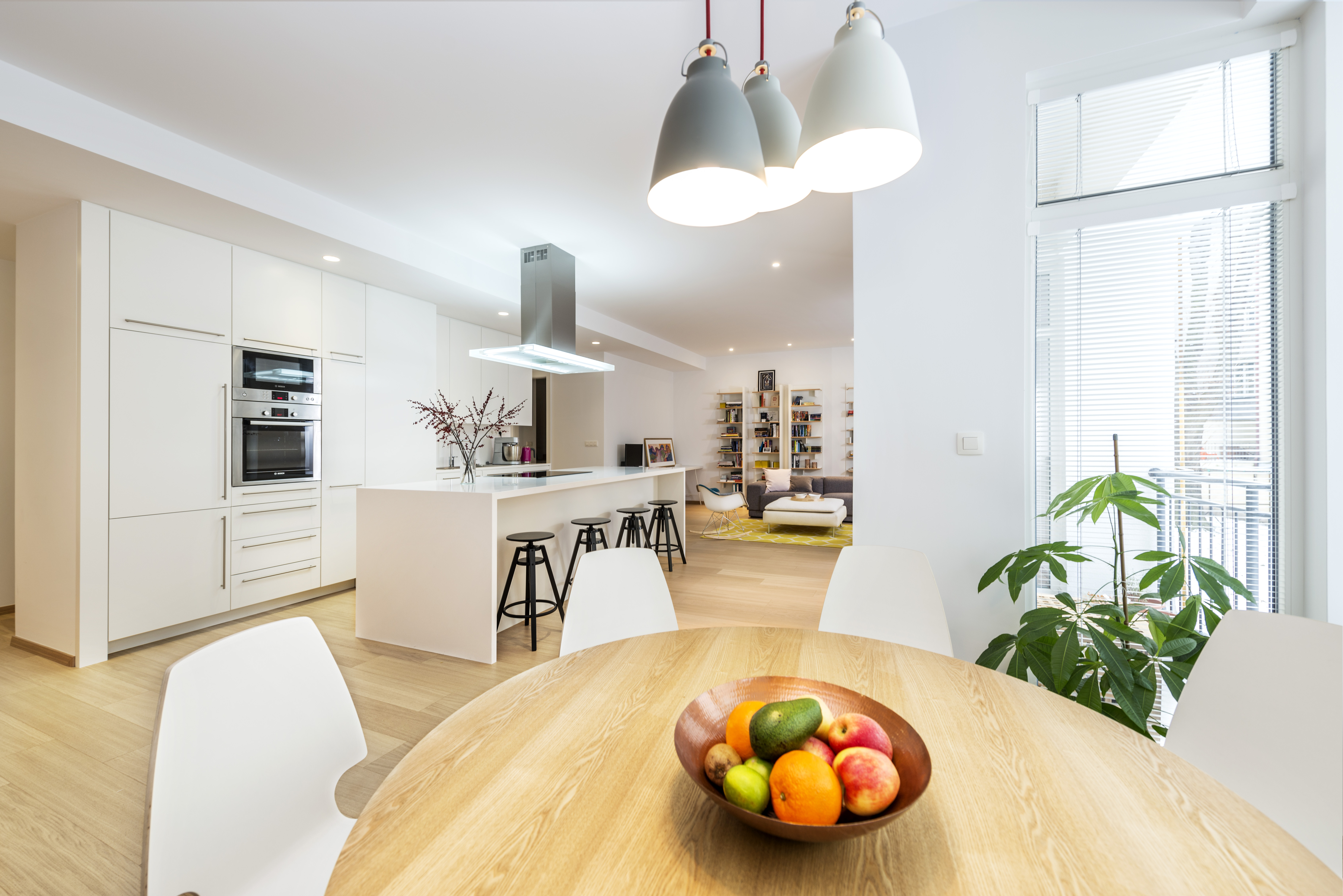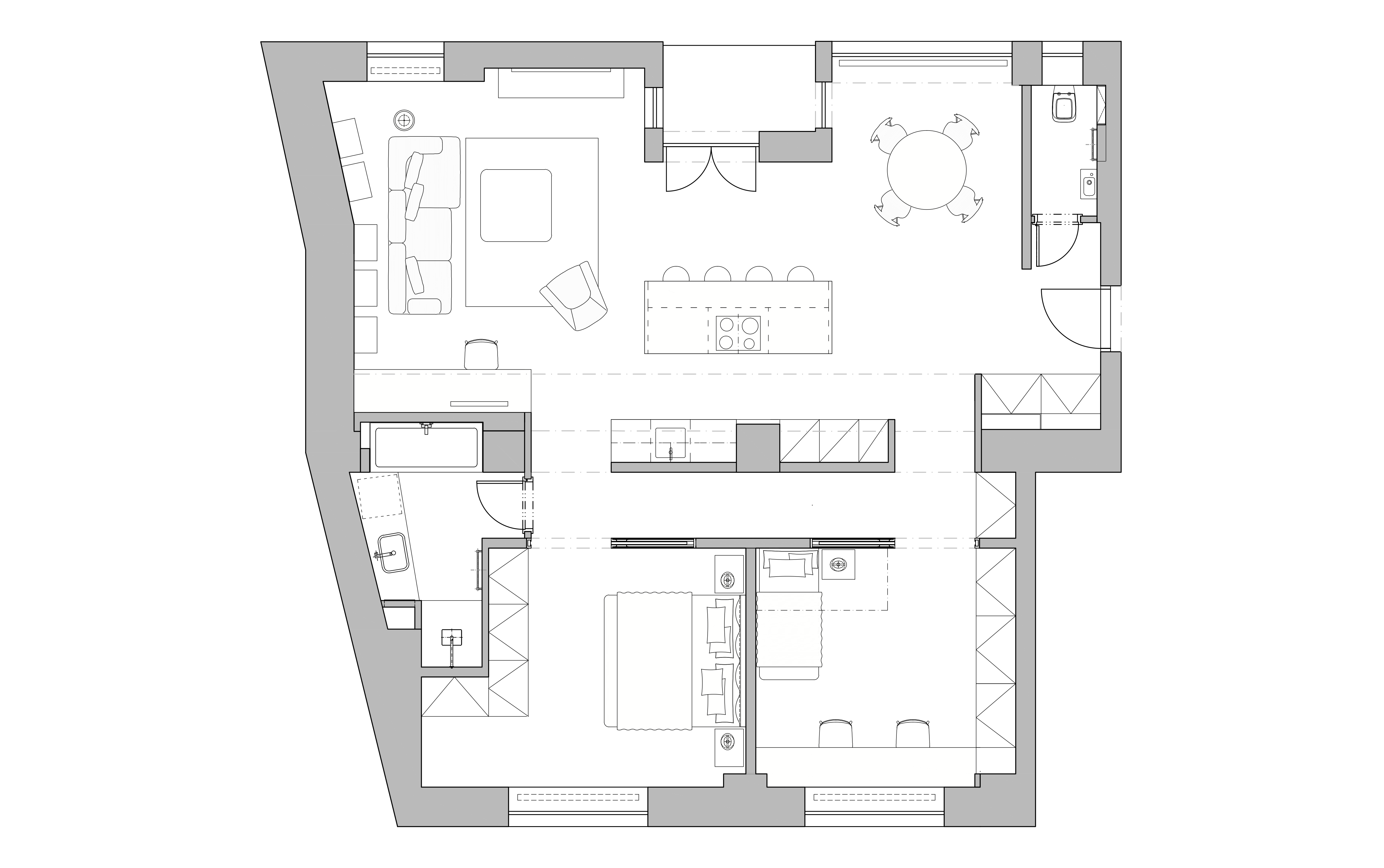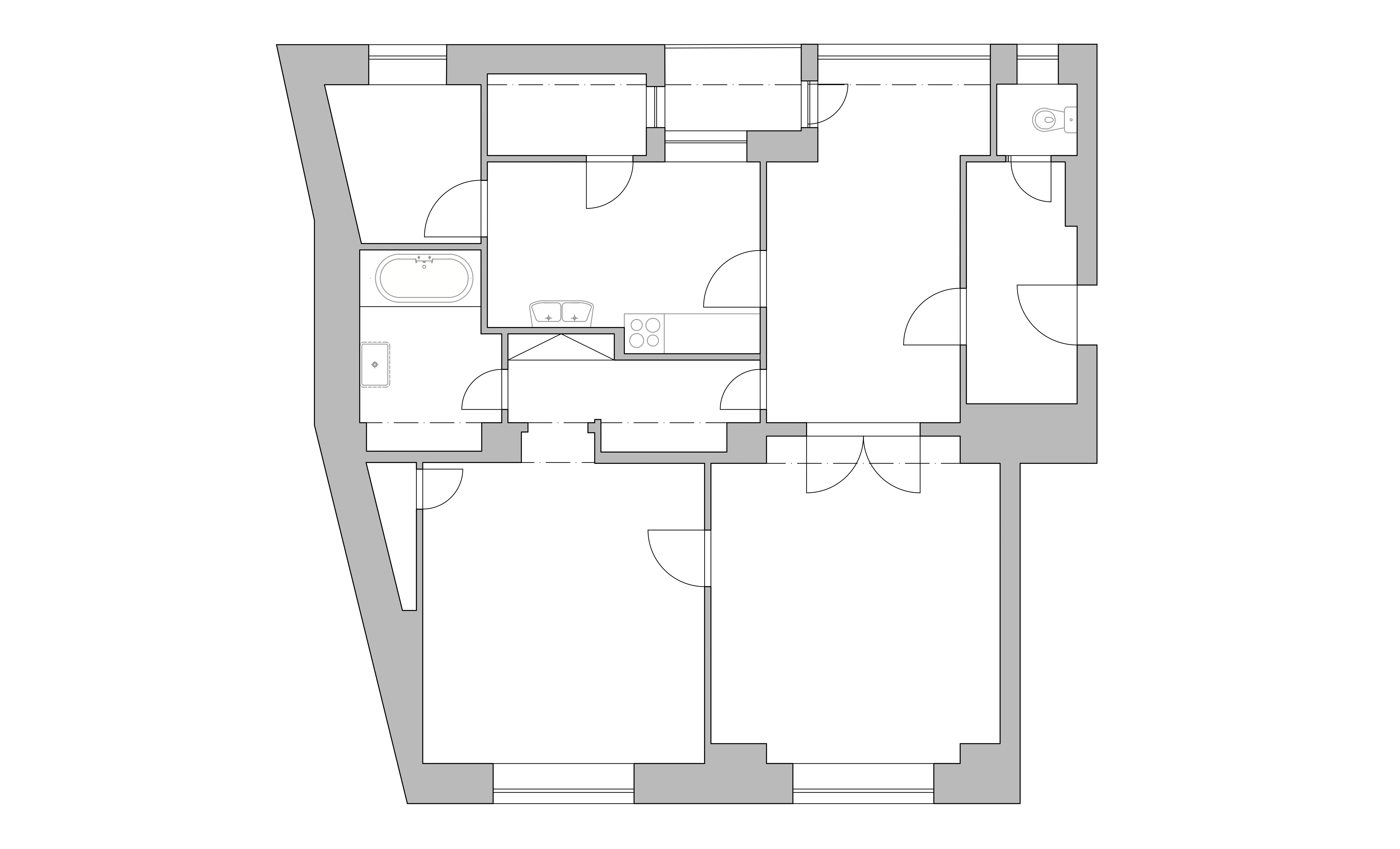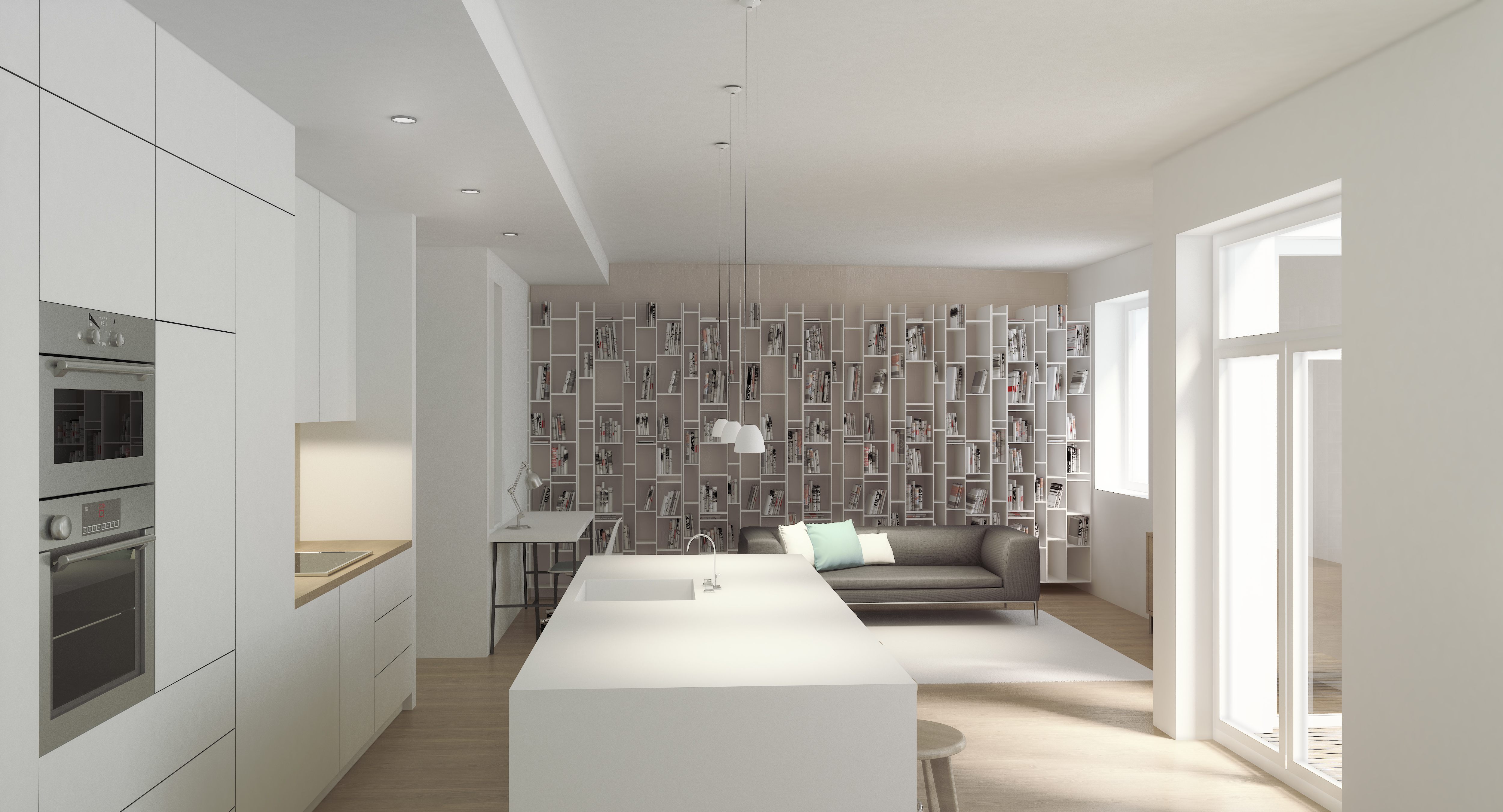- Interiér v starom bytovom dome s vysokými stropmi. Byt s pôvodne tmavou spoločenskou miestnosťou, rozdelený na množstvo malých miestností, sa v maximálnej možnej podarilo otvoriť. Vznikol svetlý a vzdušný interiér.