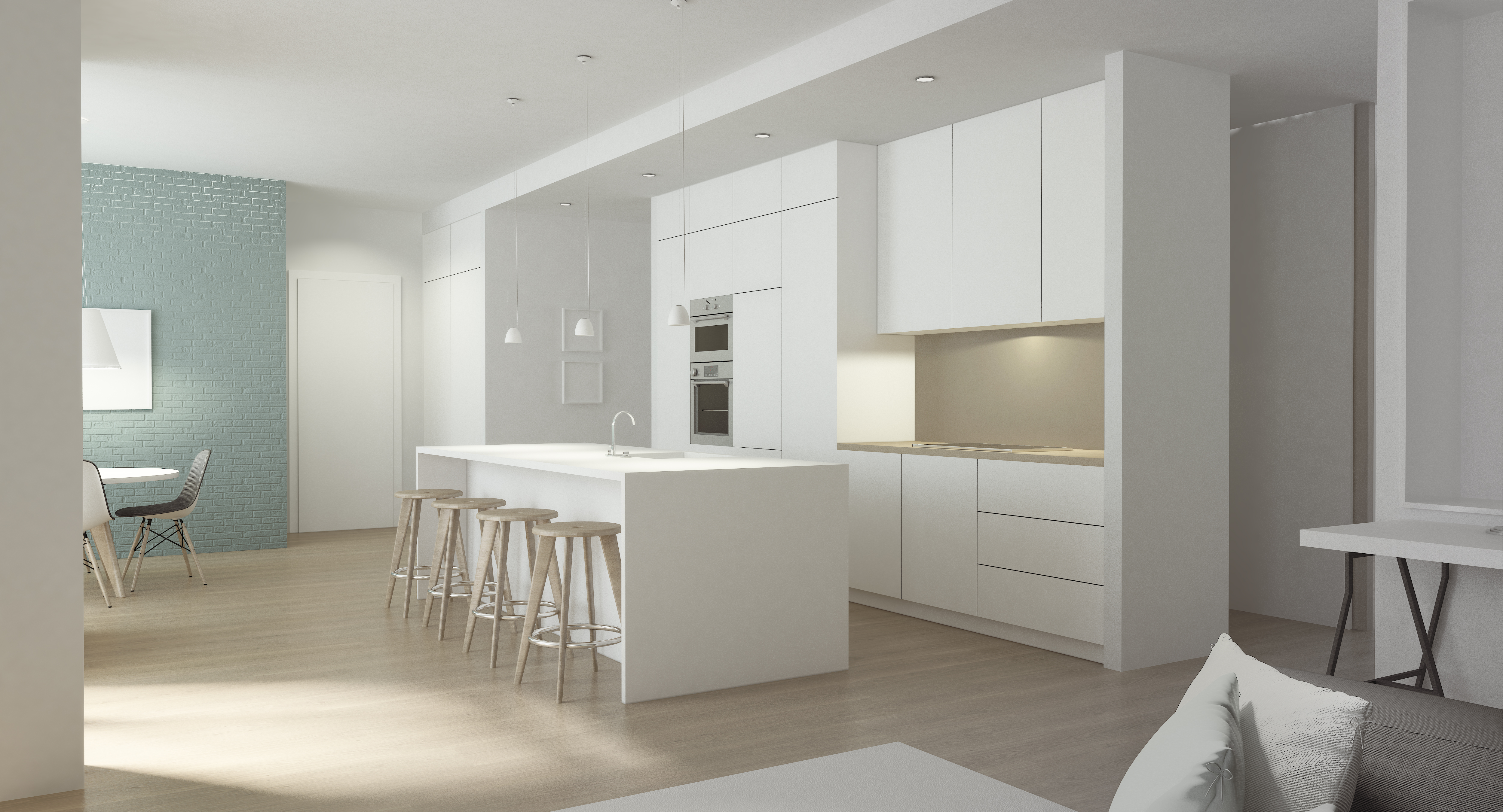 Oddychová časť bytu je od spoločenskej oddelená iba objemom kuchynskej linky v priestore a znížením podhľadu. Podhľad zároveň schoval masívny preklad a umožnil zabudovanie svietidiel. Zo vzniknutej chodby za linkou vedú do spální posuvné dvere na celú výšku priestoru. Pri ich zasunutí plne vyniká maximálne otvorené riešenie dispozície. Byt sa nachádza na 1.NP a obývacia časť je orientovaná do vnútrobloku so vzrastlou zeleňou. Aj preto bola pre interiér zvolená prevažne biela v kombinácii so svetlým drevom, doplnená o rôzne drobné farebné akcenty. Byt takto získal požadovaný charakter priestranného a svetlého bývania.