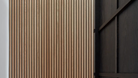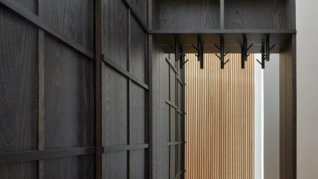 Celý byt je verný jednému materiálu, ide o dubový masív a dyhu. Rôzne morenia potom naznačujú jednotlivé zóny – svetlá kuchyňa ako metafora rána, transparentný lak ku dňu a tmavé morenie k noci.