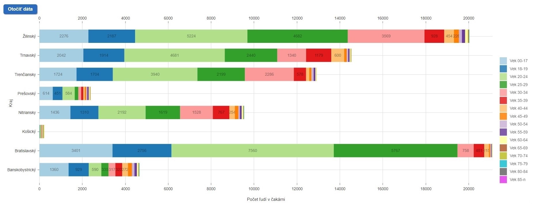 Pre porovnanie, kým v Bratislavskom kraji čaká v tejto chvíli na očkovanie 7 560 mladých ľudí vo veku od 20 do 24 rokov, v Prešovskom je to len 584 a v Košickom iba 26. Podobné rozdiely sú aj v ostatných kategóriách.