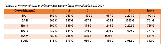 Hore tak nešli iba ceny bytov, ale aj nájom. Ten sa posledný rok vrátane energií pohyboval okolo 12,78 €/m². V porovnaní s druhým štvrťrokom 2021 tak došlo k rastu cien priemerného nájomného až o 11,5 %. Za nadpriemerným rastom stojí do istej miery bázický efekt, keď sa ceny nájomného zotavili po prepade, ktorý vznikol v dôsledku pandémie. Priemerné nájomné vyjadrené v absolútnom čísle v Bratislave dosiahlo 812 € za mesiac.