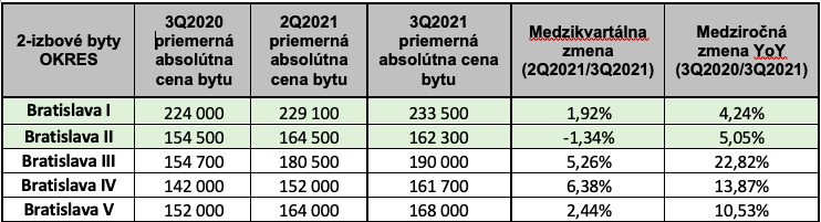 V mestských častiach Bratislavy môžeme vidieť mierny medzikvartálny rast cien. Dokonca mierny pokles môžeme sledovať v Bratislave II a III.