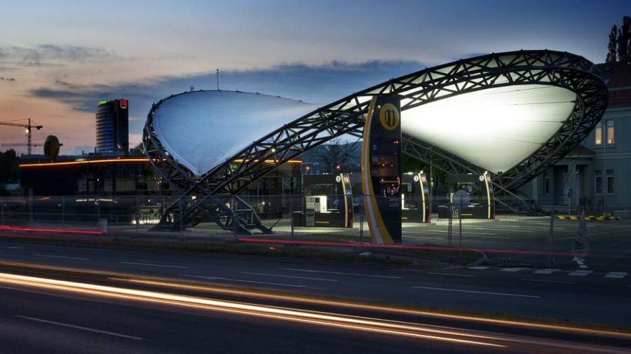 - Podoba čerpacej stanice je výsledkom architektonickej súťaže organizovanej investorom v roku 2013. V súťaži zvíťazil projekt ateliéru ALEXY & ALEXY, ktorý zaujal elegantnou konštrukciou prestrešenia a ekologickým konceptom.