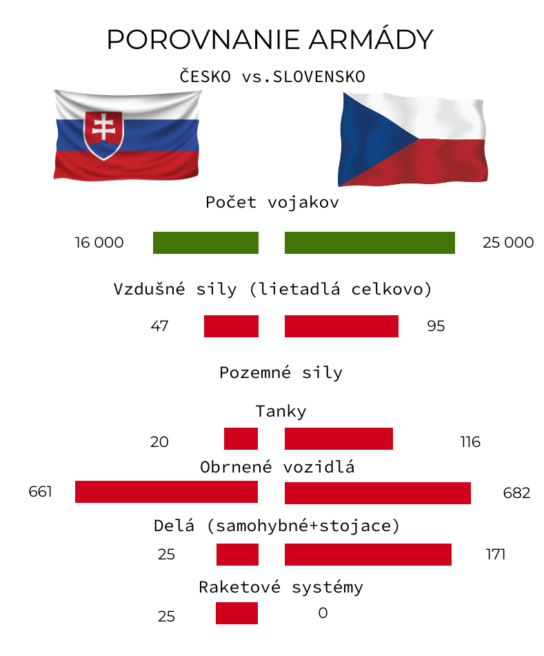 Vo vybavení sme na tom dosť podobne. Česi majú viac vojakov aj vzdušných síl, my však máme viac raketových systémov.