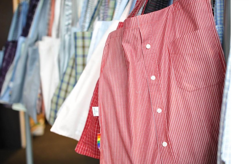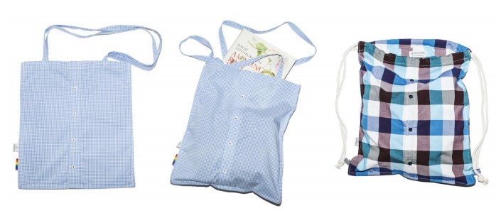 Konferenčné tašky vyrábame z použitých pánskych košiel, dodaných alebo nakupovaných taktiež v sekáčoch. Šijeme ich v dvoch štandardizovaných strihoch. Prvý model má formu klasickej tašky s uchom a druhý je v podobe malého ruksaku.