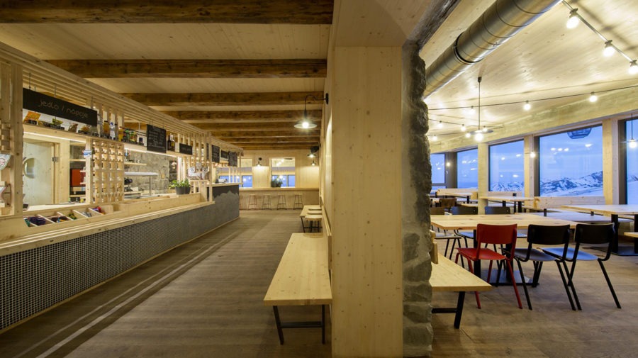 Pravdepodobne najväčšou výzvou pre interiérových dizajnérov bolo zachovať atmosféru horskej chaty vďaka materiálom. Aj preto pravdepodobne štúdio Rules pod vedením Ing.arch. Márie Dida stavilo na prirodzenú krásu kameňa, dreva a pohľadového betónu. Priznané drevené trámy a obloženie, „nahé“ žiarovky, jednoduché sedenie a z času na čas štipka kovu pôsobia industriálne, no zároveň dostatočne útulne na to, aby si tu teplý čaj či polievku vychutnali všetci nadšenci hôr.