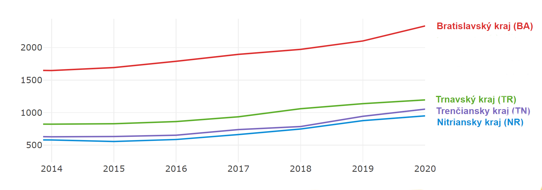 V roku 2020 stál meter štvorcový nehnuteľnosti v Bratislavskom kraji 2 333 eur, v Trnavskom kraji 1 196 eur, v Trenčianskom kraji 1 054 eur a v Nitrianskom kraji iba 951 eur.