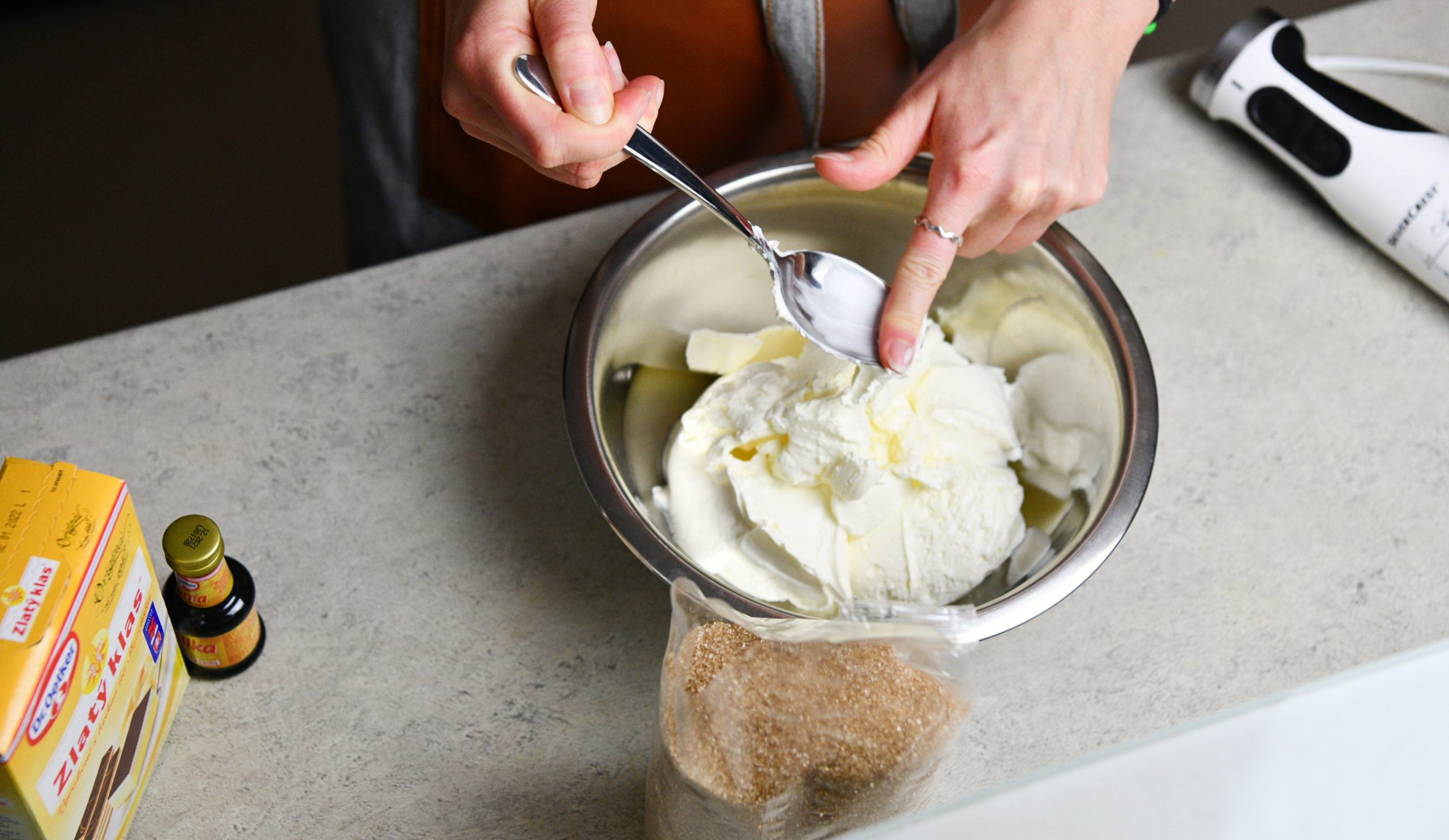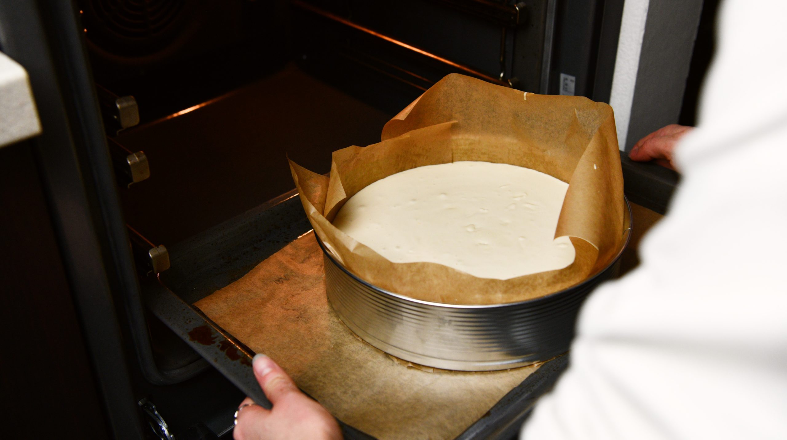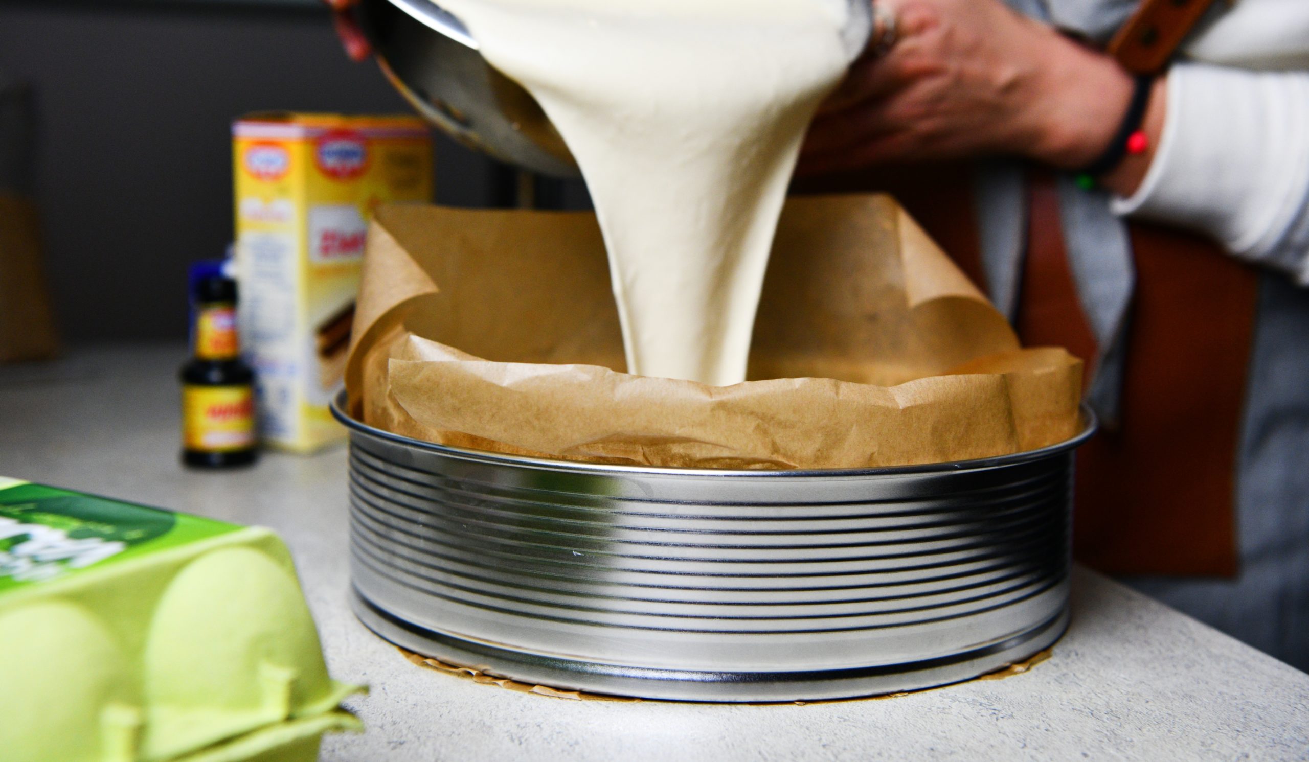 Na začiatku sme krémový syr zmiešali s cukrom a soľou, následne primiešavali vajíčka. Zmes sme ochutili vanilkovým extraktom a šľahačkovou smotanou. Pri pomalom miešaní nasleduje múka na zahustenie a tekutá zmes následne putuje do pripravenej formy na pečenie.