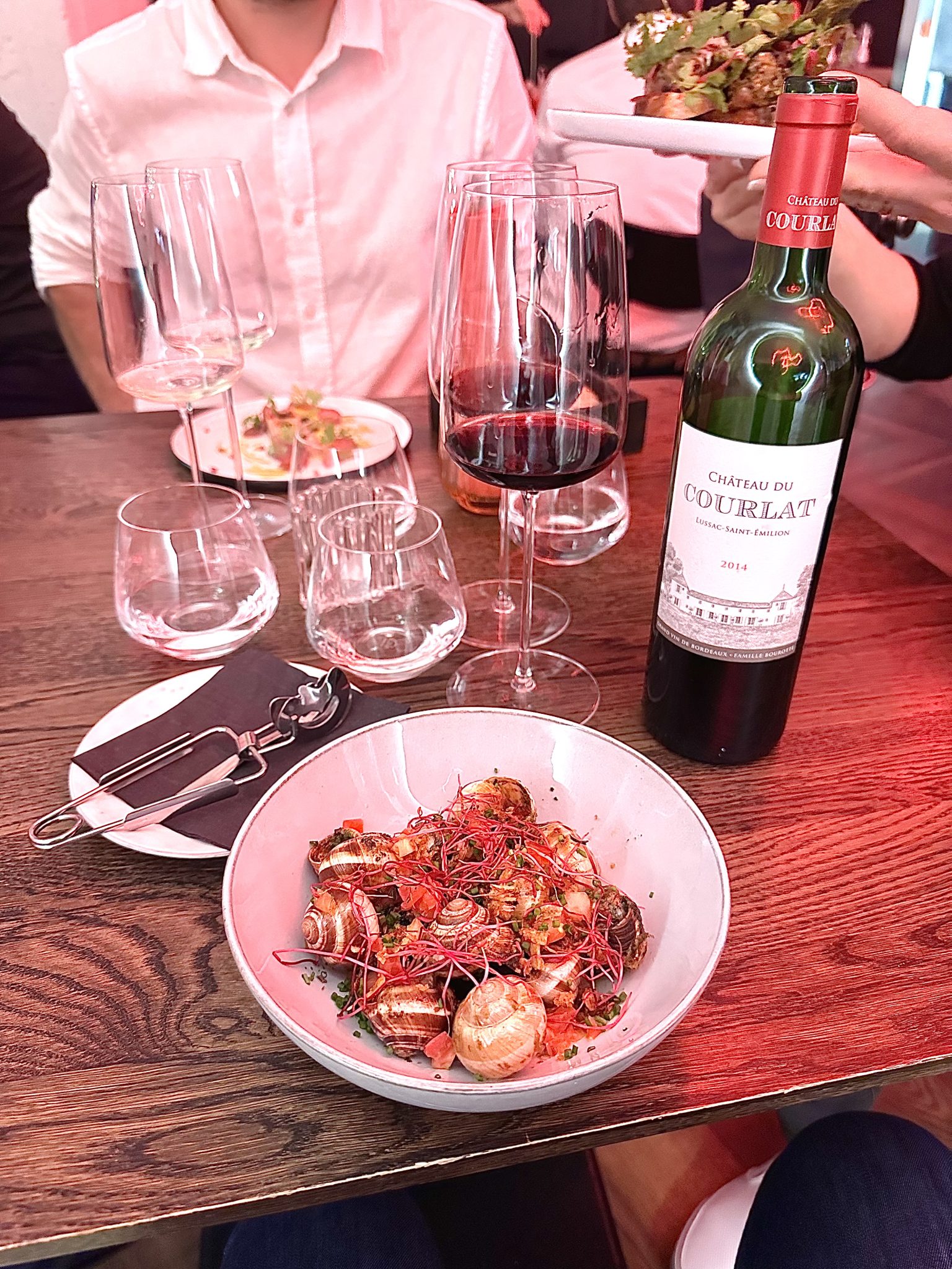 Fantastická chuť, veľa masla a byliniek, kvásková bageta a kopec srandy pri snahe o ich uchopenie kliešťami. Odporúčam. Cena 14,9 €.
