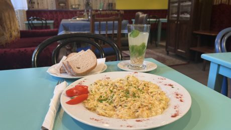 Obrovský tanier (podľa mňa až zbytočne veľká porcia) veľmi dobre spravených vajíčok s riadnou dávkou masla a cibule. Presne tak, ako to mám rád. Mám len dve výhrady. Červenou paprikou obsypaný okraj taniera je predsa nezmysel. Tá paprika patrí na praženicu a veľmi sa tam hodí. No a klasický neduh – nie veľmi kvalitný a nie veľmi čerstvý chlieb. Keby bol aspoň nasucho opečený, bolo by to top.