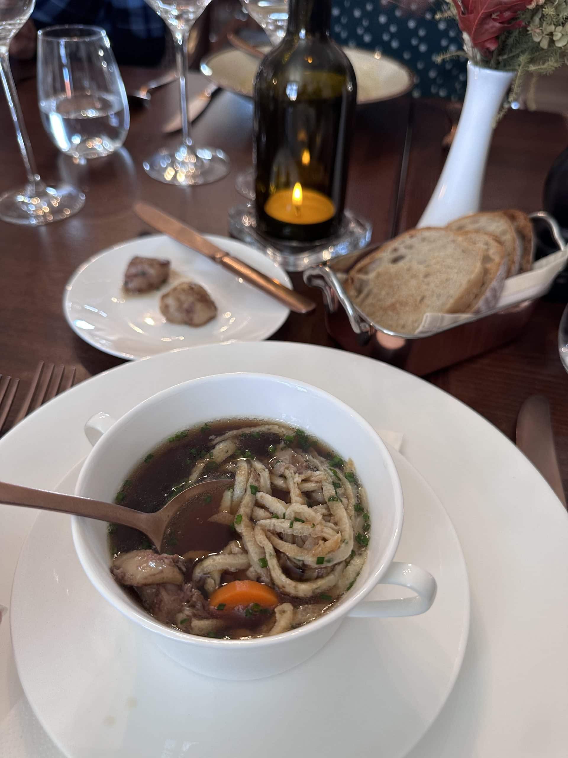 Esenciou rakúsko-uhorskej kuchyne je pre mňa Tafelspitz, ktorý mi v takomto prevedení veľmi chýbal. Jedlo má v zásade samo osebe tri chody a naozaj k nemu už netreba ani predjedlo, ani nič iné. Začína extrémne temne silným vývarom s celestínskymi rezance (v zásade palacinkové cesto), ktoré sa konečne nerozpadali a mali svoju chuť aj textúru.