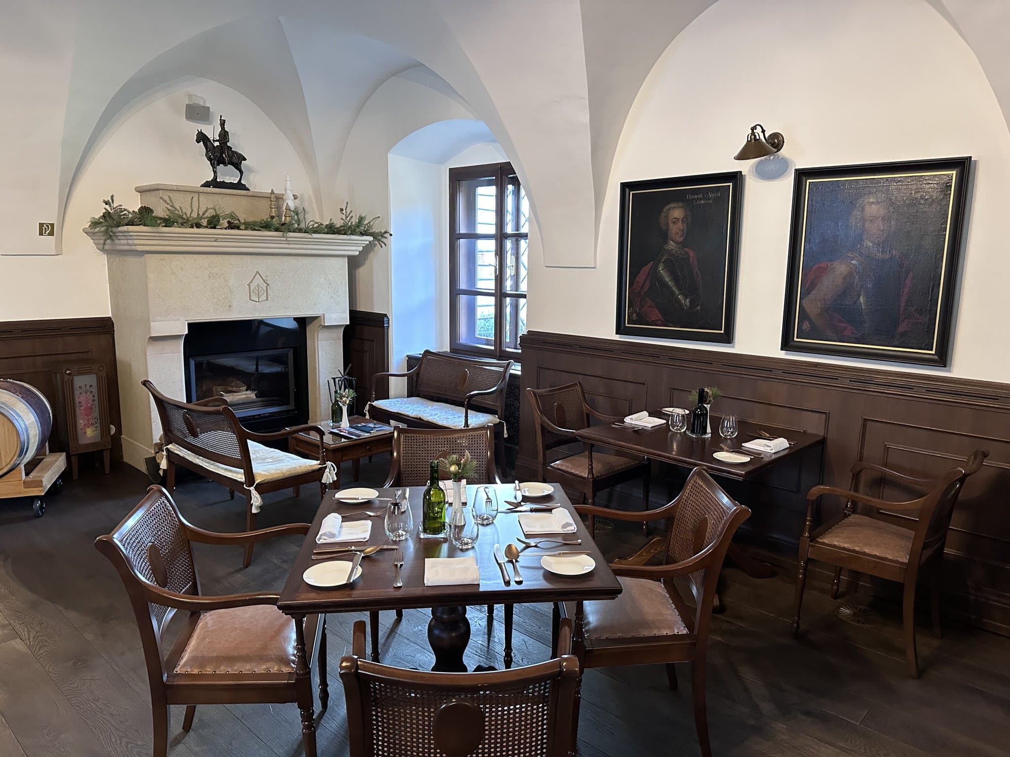 Interiér Palatínu je vkusne zariadený, drevené stoly, krb, látkové prestierania, ale aj zaujímavý príbor či poháre na víno na stoloch (prirodzene – veď tu majú vlastné vinárstvo). Čašníci sú vzorne upravení a dokonale ovládajú každé jedlo aj víno z lístka.