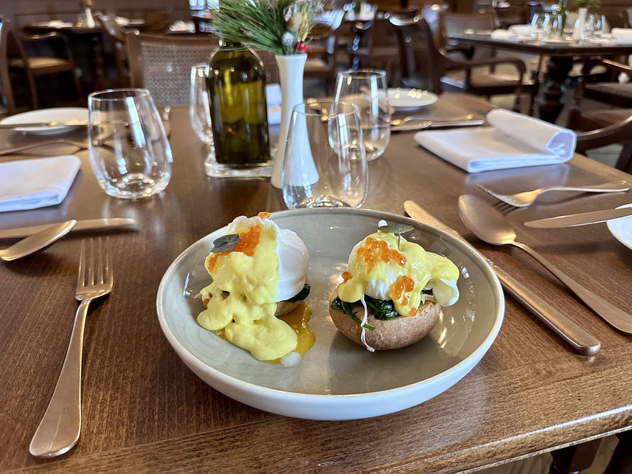 Pár jedál, jednoduché a pekne vyskladané. Pošírované vajíčko má geniálnu konzistenciu. Kaviár je zábavný a holandská akurátne krémová. Brioška na vrchu chrumkavá a vnútri vláčna. Nie som fanúšik Benediktov s rybou namiesto šunky/slaniny, ale toto funguje.