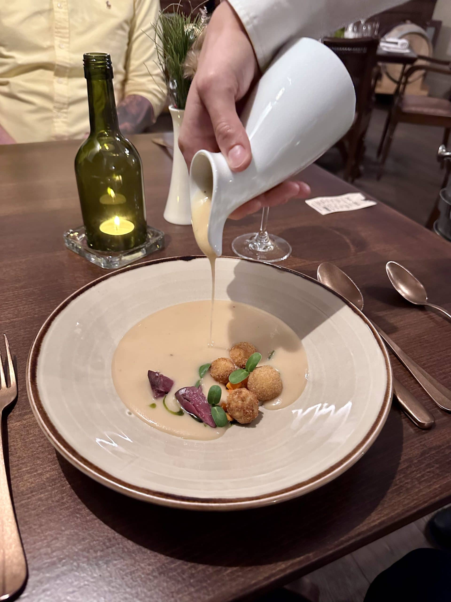 Neviem, či som jedol lepšie urobené srdcia, ktoré boli jeho súčasťou rovnako ako kroketky zo zeleru, ktoré tomuto krému dodávali zemitosť a príťažlivosť. Ak by bola chuť krému výrazne mäsitejšia, bolo by to dokonalé. Cena 9 €. Tu sa pristavím.