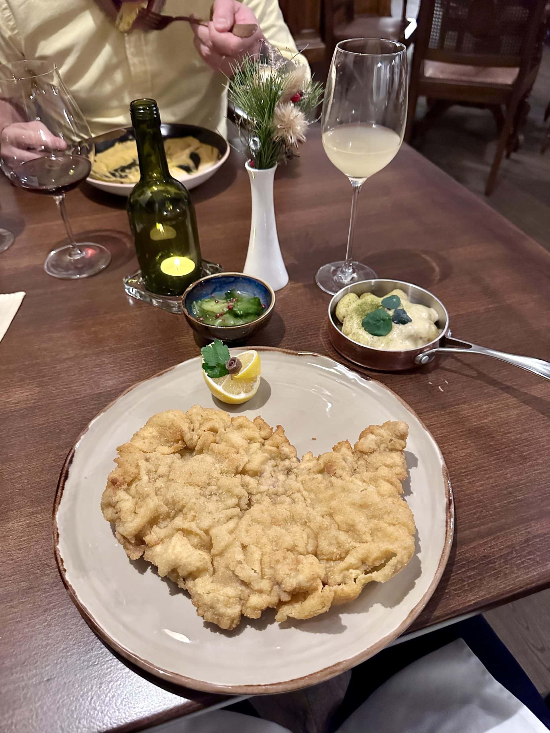 Chýbať nesmie viedenský rezeň. Obrovský, mäkký, chutný a voňavý, pretože sa smaží v čistom masle a to ma totálne dostalo. Neviem, či som jedol lepší. Zemiaky vynikajúce, ale gamechanger je tu sladkavý a jemne pikantný uhorkový šalát. Cena za gigantickú porciu je 32 €.