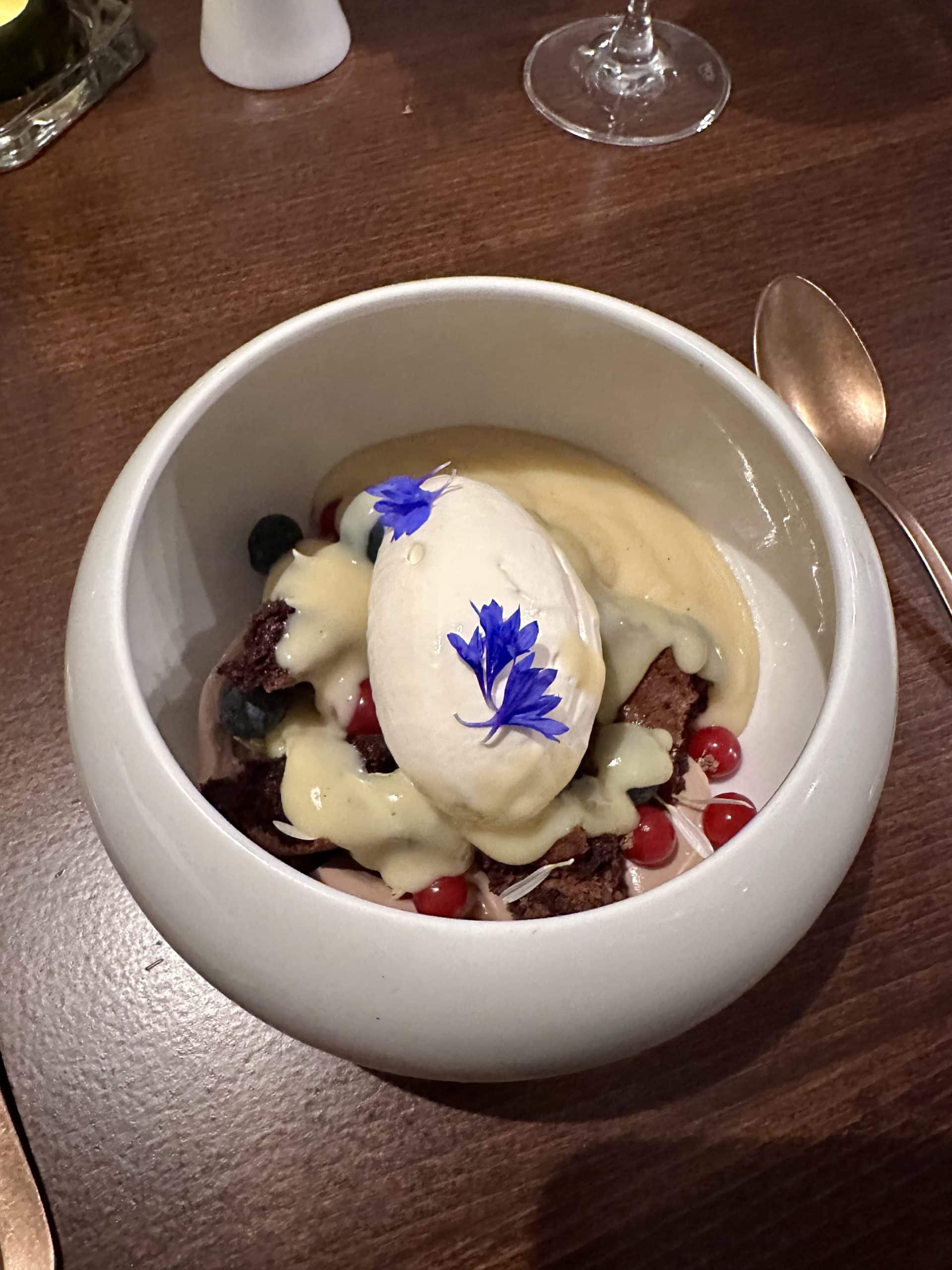 Nesmie chýbať divina a musím povedať, že jeleň je dobrá voľba. Mäkučký, doplnený o chrumkavé šišky, ríbezle či hutný, až čokoládou chutiaci demi glace, dulu a huby. Čisto jesenný les na tanieri. Cena 29 €. K tomuto si rozhodne daj Pinot Noir a užívaj.