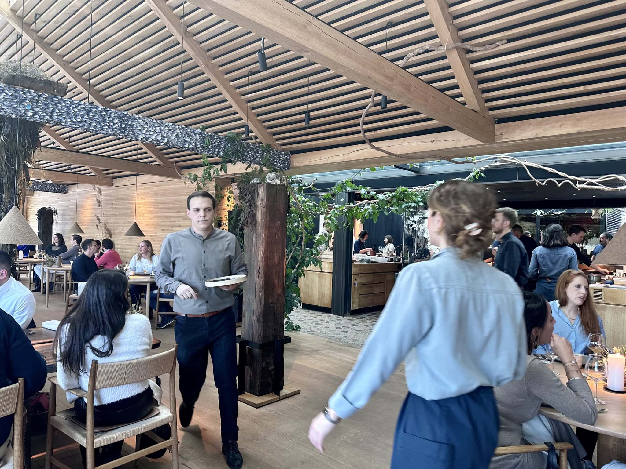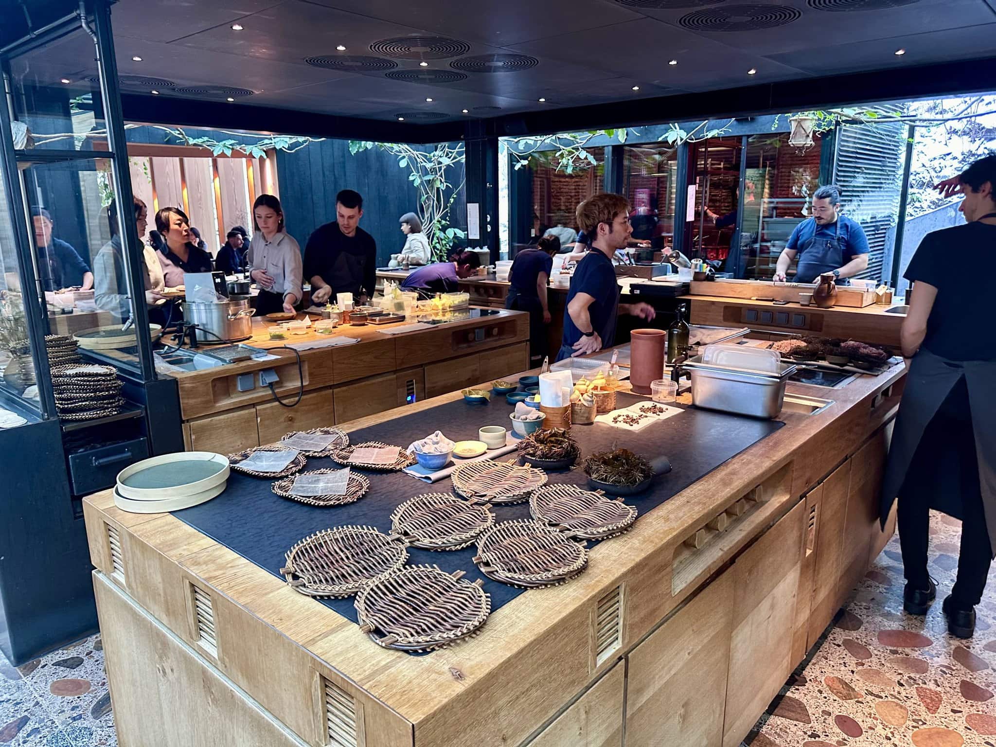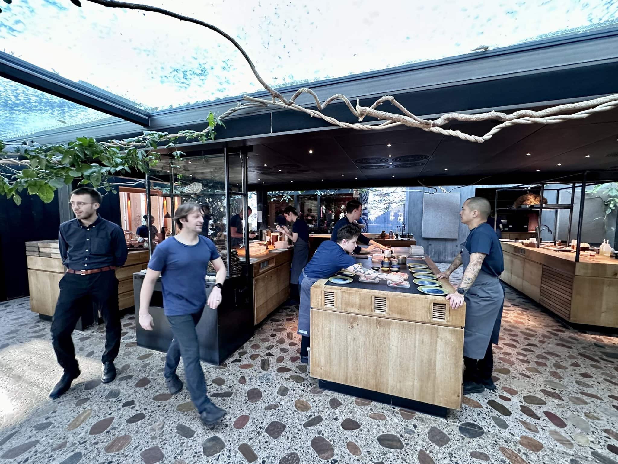 Je však vidno, že nejde o žiaden vojenský režim, ale skôr spríjemnenie šou pre hostí. Za otvorenou kuchyňou je ďalšia prípravovňa, kde sa pohybovalo približne 30 ďalších kuchárov. Na pľaci sa o hostí staralo okolo 10 čašníkov. Celkovo má NOMA asi 110 zamestnancov. Pôsobivé.