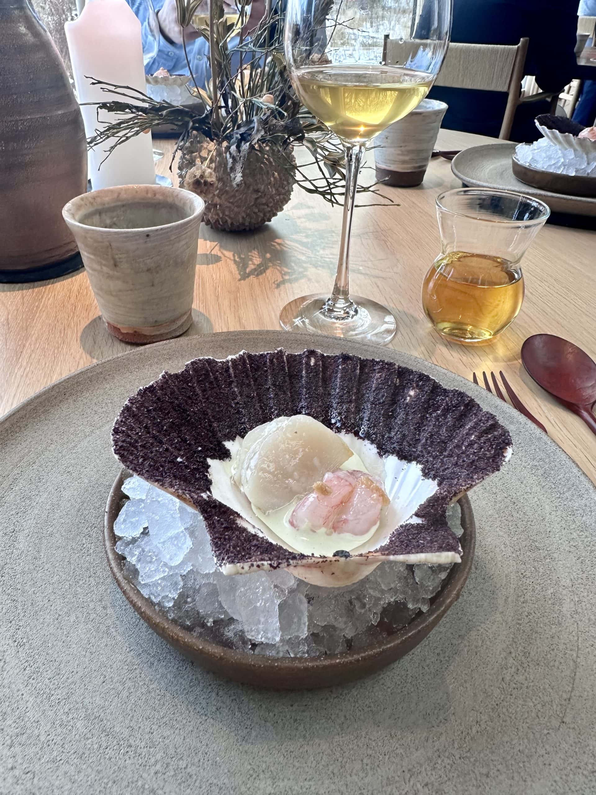 Krásnym chodom bola čerstvosťou nabitá mušľa svätého Jakuba. Jemne z jednej strany osmažená, so sladkou krevetou, s emulziou z čaju sencha a z islandský rias, ktoré rastú v Dánsku. Neuveriteľná plnosť chutí. Jeden z najlepších chodov, čo som v živote jedol.