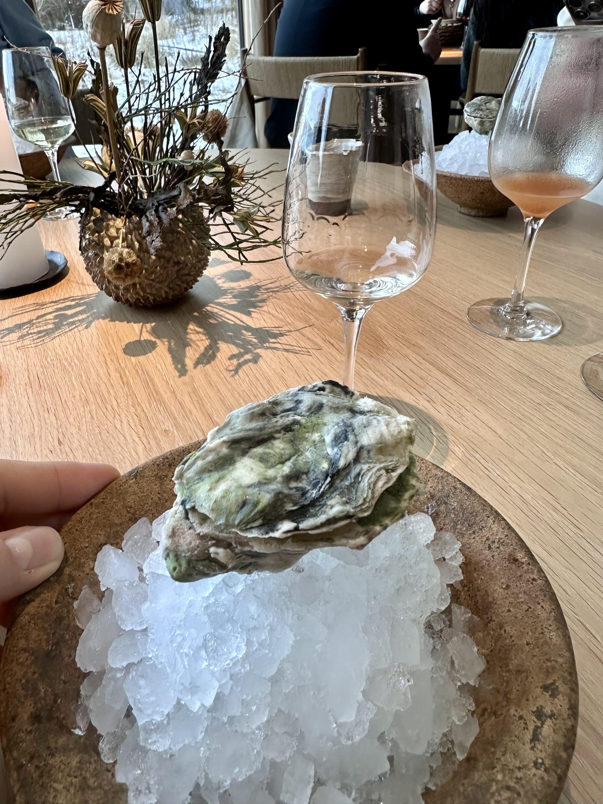 Potom prišiel jeden z najpôsobivejších a najchutnejších dezertov môjho života. Pristála nám na stole na lade servírovaná ustrica.